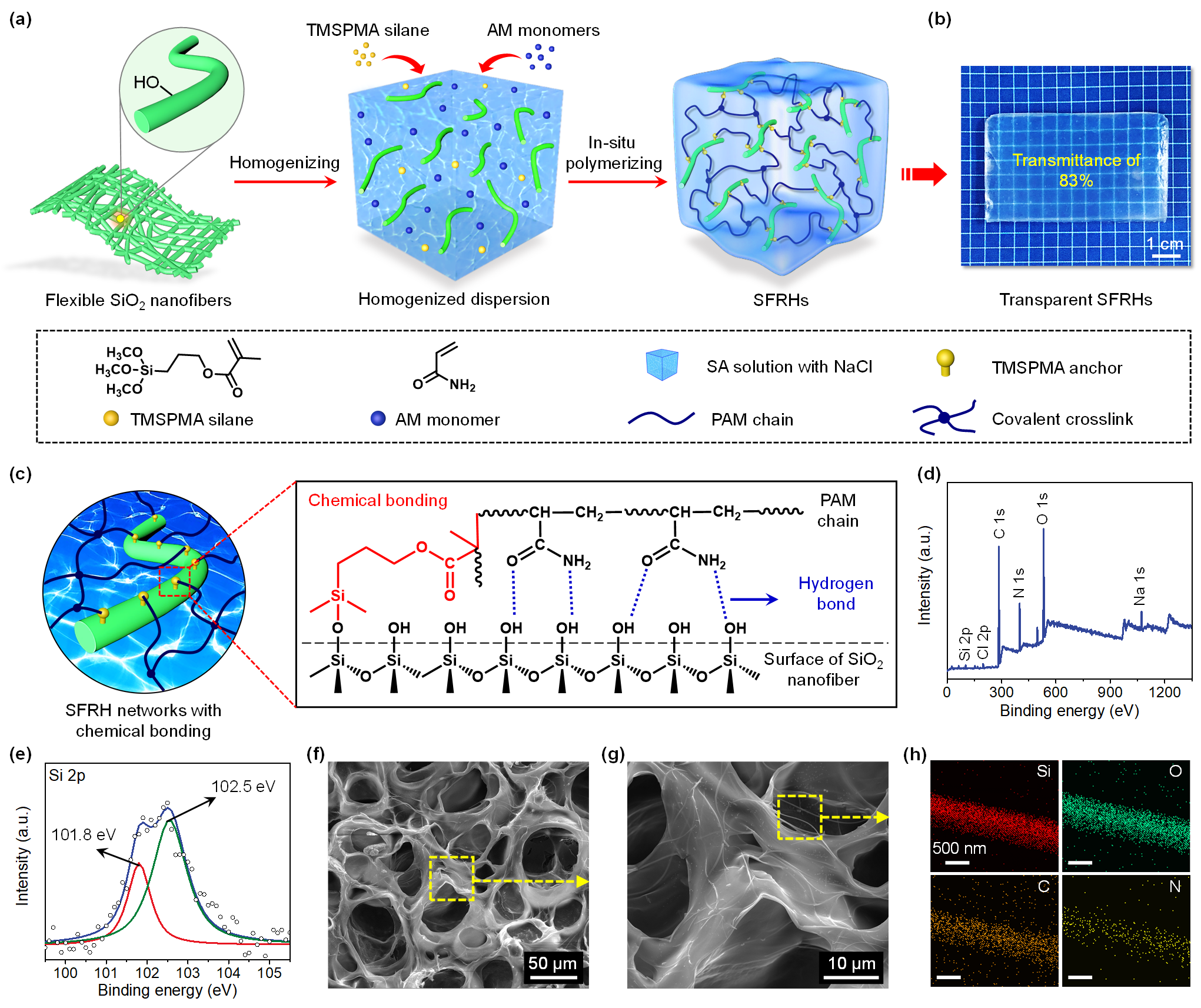 �D1. a���{���w�S����ˮ���z���Ƃ�ʾ��D��b���{���w�S����ˮ���z�Ĺ�W�D��c����������{���w�S��PAM�֮�g������/���W����ʾ��D��d��ˮ���z��XPS���V��e��SiԪ�صĸ߷ֱ�XPS���V��f��g����ͬ�Ŵ���ˮ���z��SEM�D��h��EDS�D�V��