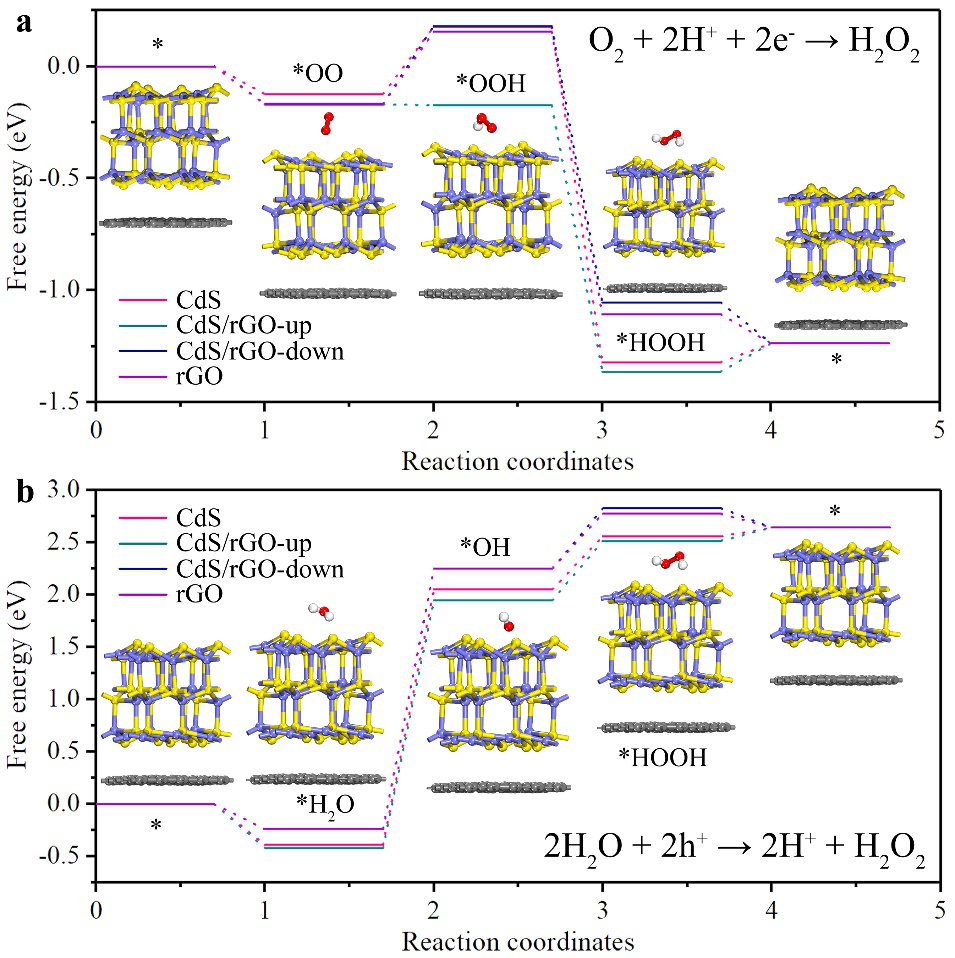 ����CdS/rGO�ͺϲ����Ƿ������տ��еĹ����������Mһ��ͨ�^�ܶȷ�����Փ��DFT��Ӌ���U����H2O2���ɵĹ���C��, ��D4��ʾ��H2O2������Ҫ��Դ�ڃɂ�·����������߀ԭ��ORR��·����ˮ��������WOR��·�����Y�����������^��CdS���ԣ�rGO�Ĵ���������늺��D�ƣ��M��ͬ�r���MORR��WOR�ɗl·����ͬ�r������ORR·�����܉��h����WOR·��������H2O2���ɵ���Ҫ�C����ORR�^�����@Ҳ�c���Y�����Ǻ���