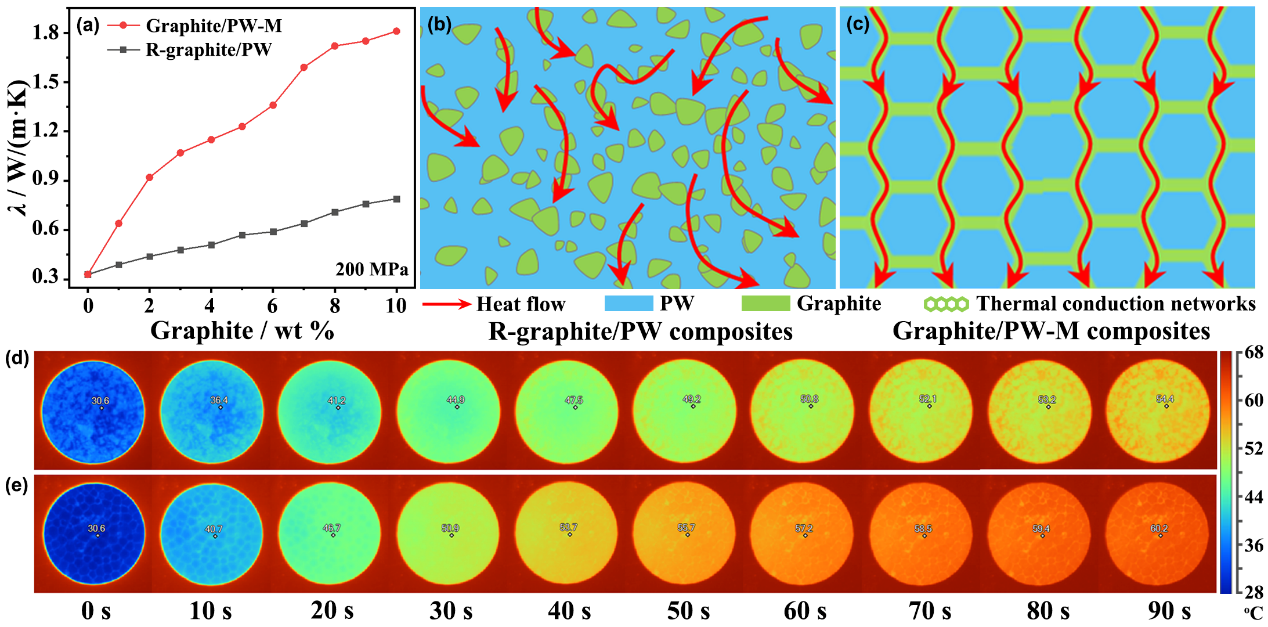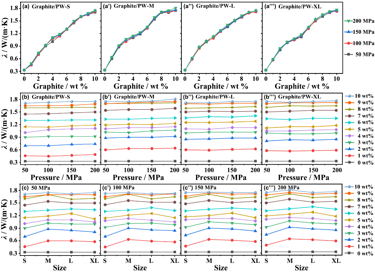 �о��Y������������ͬʯī������ģ����������ʯī/ʯϞ����ͺϲ��ϵČ���W�j�ܶȾ������ֵ���˕r�ʬF��ѵČ������ܣ�����ͬ����ʯϞ���ʯī/ʯϞ����ͺϲ��ϵ����S����W�j�ܶȵ����Ӷ������������������uƽ������ʯī������10 wt%��ģ��������200 MPa��ʯϞ��������2.08��0.08 mm�r��ʯī/ʯϞ����ͺϲ��Ͼ�����ѵ�����1.81 W/(m·K)�����h������ͬʯī������ģ�������Ƃ�����ɷ�ɢ��B��ʯī/ʯϞ����ͺϲ��ϵ�����0.79 W/(m·K)����ʯī/ʯϞ����ͺϲ��ϱ���Ĵ�ĥ̎�����ƉČ���W�j�������ԣ���ʹ��������½���������H��1.13 W/(m·K)���������Ќ���W�j�����ɷ�ɢ��B��ʯī/ʯϞ����ͺϲ���ͨ�^�ָ�ؽM�ķ�ʽ��׃�䌧��W�j�ֲ����ؽM��ʯī/ʯϞ�ͺϲ��ϵ����S�ָ����ؽM�Δ����Ӷ����ͣ���С���H��0.85 W/(m·K)�������w����������W�j�ܶ�Խ��������W�j�ֲ�Խ����������W�jԽ������ʯī/ʯϞ����ͺϲ��ϵČ�������Խ����
