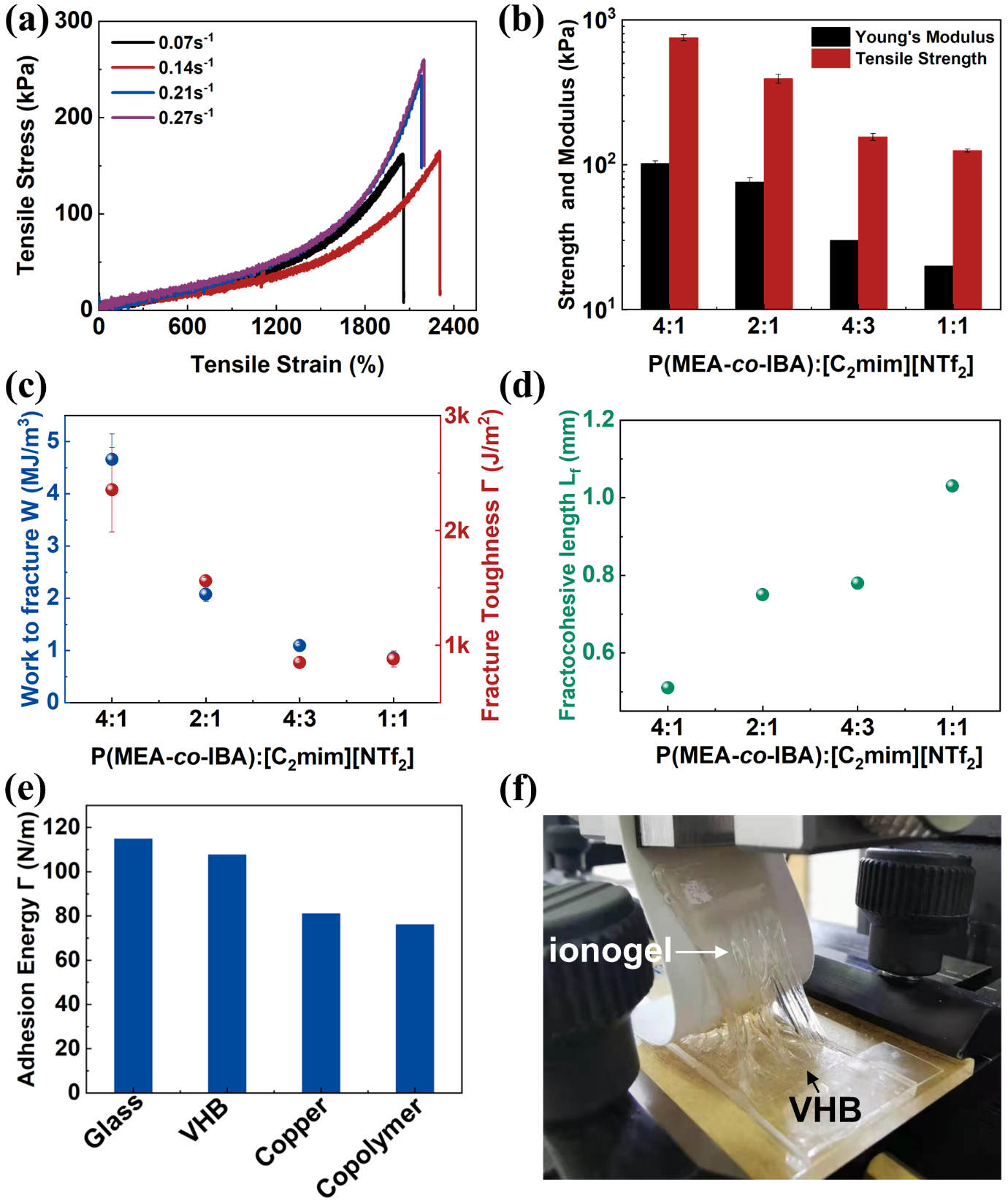 ���W�������棬�����쑪׃����0.07-0.27 s-1֮�g׃���r��ԓ�x��Һ�w���z�Ĕ��ё�׃�����^2000%���D4a��������������x��Һ�w�������4:1-1:1֮�g׃���r��ԓ�x��Һ�w���z�ė���ģ����102-20 kPa֮�g�����Ƚ���752��125 kPa֮�g���D4b�������ѹ��͔����g�Էքe��4.85-0.85 MJ/m3��2350-880 J/m2֮�g�������Ĕ��уȾ��L����0.51-1.03 mm֮�g(�D4c-d)������֮�⣬ԓ���ϺͲ�����VHB�����ټ����ֹ���������γ��^����ճ�ӣ��D4e-f����