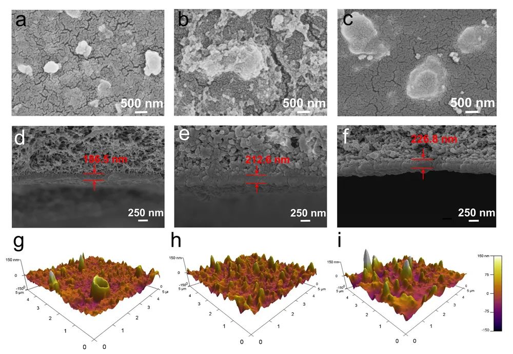 �D3 M0��M0-(PEI/PA)1 �� M0-(PEI/PA)2 Ĥ��SEM���棨a-c��������SEM ��d-f����AFM �߶ȈD��g-i��
