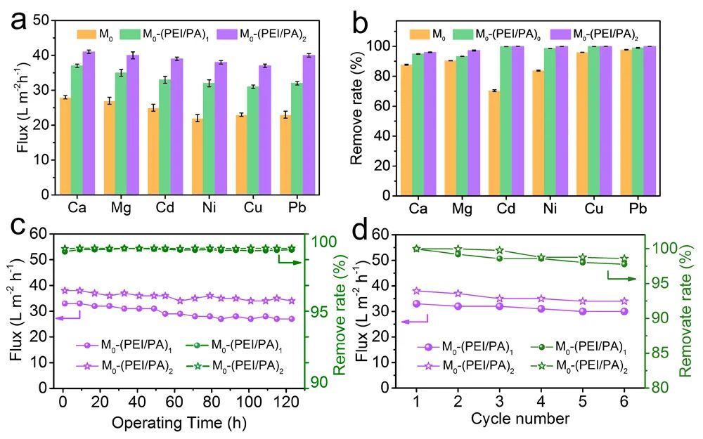 ���ߜyԇ��Ĥ����Ȟ�500 ppm �����x��Ca2+��Mg2+��Cd2+��Ni2+��Cu2+ ��Pb2+ˮͨ����ȥ���ʣ��D5a-b����ֲ�Ṧ�ܻ����Եď�(f��)��Ĥ��ȳ�ʼ�ľ��������Ĥˮͨ���ͽ����ʶ������@����ߡ�M0-(PEI/PA)1Ĥ��Cd2+��Cu2+�� Pb2+ȥ���ʞ�99.771%, 99.860% and 98.972%��M0-(PEI/PA)2 Ĥ��Cd2+��100.000%����Cu2+��100.000%���� Pb2+��99.999%�����F(xi��n)���O��ȥ���ʣ��Ɍ��ߝ���ؽ����x��Cd2+��Cu2+ �� Pb2+ �Uˮ�����O�͵ĝ��ˮƽ���քe�s��~0 ppb��0 ppb ��5 ppb���@��ֵ�h(yu��n)���������h(hu��n)�����o(h��)��EPA���������l(w��i)���M����WHO���J(r��n)�������ˮƽ�����ˮ�����SCd2+��Cu2+ �� Pb2+ ��ȷքe��5 ppb��1000 ppb��15 ppb����M0-(PEI/PA)2 Ĥ�������x��ȥ�����܃�(y��u)��Ŀǰ�������һЩĤ���ϡ��M(j��n)һ�����߿�����Ĥ�IJ�����(w��n)���Ժ��������ܡ�M0-(PEI/PA)1 �� M0-(PEI/PA)2 ���F(xi��n)�����õ��L�ڲ�����(w��n)���Ժ��������ܣ��D5c-d����