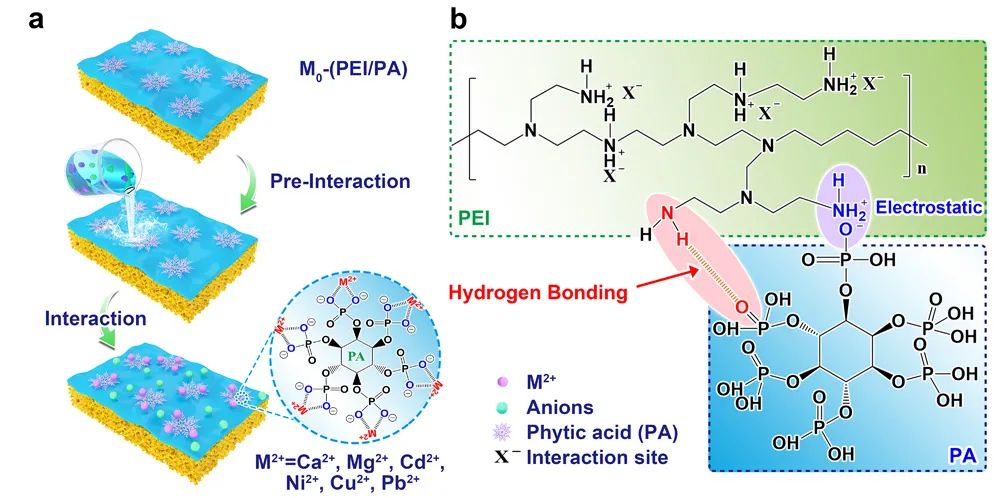 ����������M0-(PEI/PA) Ĥ���ؽ����x�Ӹ�ȥ���ʿ��ܵęC(j��)���������D6�����ڂ��y(t��ng)����������{�VĤ����ͨ�^����ϩ������PEI����PA�ČӌӽM�b���ԣ����븻���������ֲ����ӡ�PEI��PA֮�g������ؓ(f��)늺ɵ��o�����֮�⣬߀����N-H···O���I���ã��@��ʹ��PA�����ι̵ظ����ڏ�(f��)��Ĥ���档����ֲ���ľ��������Ĥ���͏Uˮ�еĶ��r�����x��M2+���ٵذl(f��)���j(lu��)���О飬�γ��ι̵�O--M2+-O-�I���Ķ���ˮ�еĽ����x�Ӳ��@����ˣ�M0-(PEI/PA) Ĥ��ˮ���ؽ����x��ȥ�������˳ߴ�Y�ֺ͵���Ч��(y��ng)�⣬߀��M2+-PO43-��M2+-NH2 (PEI) �Ľj(lu��)��Ч��(y��ng)��