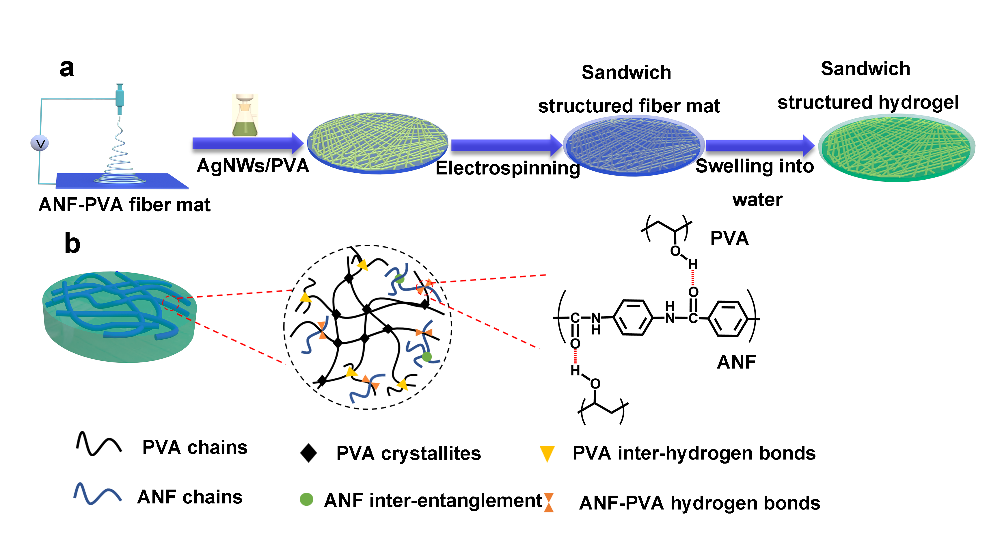 �D1. (a) ANF ���� PVA ˮ���z�;��������νY���Č���s��ˮ���z�������^��ʾ��D��(b) ANF ���� PVA ˮ���z�з����g����õ�ʾ��D��(c, d) �o늼��z���Ƃ�� ANF-PVA �w�S�ֵĈDƬ�� SEM �@�DƬ�� (e, f) ͨ�^�� ANF-PVA �w�S��������o���^�V AgNWs/PVA �Ƃ�Č���s��ˮ���z��(g, h) �����νY���Č��ˮ���z