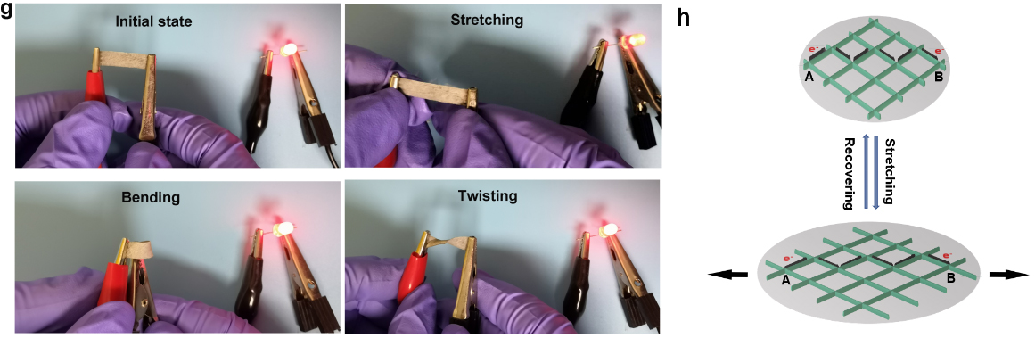 �D3. (a) �� (b) ���� ��ͬAgNWs�����Č��ANF-PVA/AgNWsˮ���z�ķ��K���ͱ��^늌��ʣ�(c) ����AgNWs�w�e�֔�0.23%��ANF-PVA/AgNWsˮ���z���쑪׃-���ֵ��(d) ���쑪׃�O����15%�l���£�ѭ�h����-�֏͵����׃����(e) �ۯB�Ƕ�180���µ�ѭ�h�ۯB-�֏͵����׃����(f) ˮ���z���쏊�Ⱥ�늌��ʵı��^��(g) ���졢������Ť���l�����ANF-PVA/AgNWsˮ���z���錧�w�c��LED���ݵĈDƬ��(h) �s��ˮ���z����ǰ��ͨ�^��늾W�j�ľW��AgNWs�W�j����ӂ�ݔ·��ʾ��D