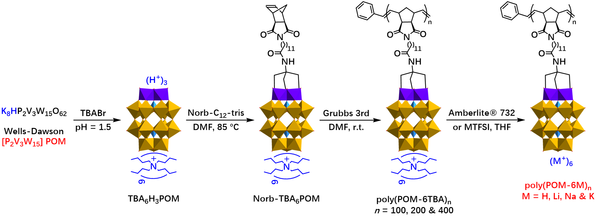 ��늽��|��һֽY����Ԫ�����x�ӻ����x���F�Ĵ���Ӿۺ��ͬ�r���оۺ���Ŀɼӹ��ԺͿ����x���x��Ĺ��ܣ����������Դ���h�����W���I���������õı��F����2014�������S�n�}�M�Mһ�������ͨ�^�_�h��λ�ۺϣ�ROMP�����ϳ���POM��Ȼ��Ă���s���ۺ�����۶��ᣨpoly(POM)�����������Ծ����ACS Macro Lett.2014, 3, 211?215����Ƕ�ι����Polym. Chem.2015, 6, 7418�C7426�������u�r�����������W���ܺʹ����ԣ�Acta Polym. Sin. 2017, 1159?1168����������ԓ�n�}�MԔ���о���poly(POM)����Һ�ԽM�b�Y����Chem. Eur. J. 2019, 25, 13396�C13401�����ڱ��wϡ��Һ�еľۺ���朘���Chin. J. Polym. Sci.2021, 39, 716?724�����Լ��c����W�Ǻ���ں����yԇǶ�ι����ﱡĤ��ȼ��늳��еĂ����ʣ�Int. J. Hydrogen Energy 2020, 45, 15495?15506�������������Ĺ����e�ۣ����������poly(POM)��늽��|�ͺ��polyelectrolytes complexes������������x��ͨ�^�x�ӽ��Q���ÓQ���|�Ӻ͉A�����x�ӣ��քe�õ�POM�����Ծ�늽��|��polyelectrolytes acids�����}�늽��|��polyelectrolytes salts����ԓ�^�̏�Wells?Dawson�͵ğo�C����F��(P2V3W15O62)9?���l���Ⱥ��^������ЙC��x������ԡ�POM���ЙC���r�s�����s�����w�ľۺϷ������s����늽��|������x�ӽ��Q������D1��ʾ��