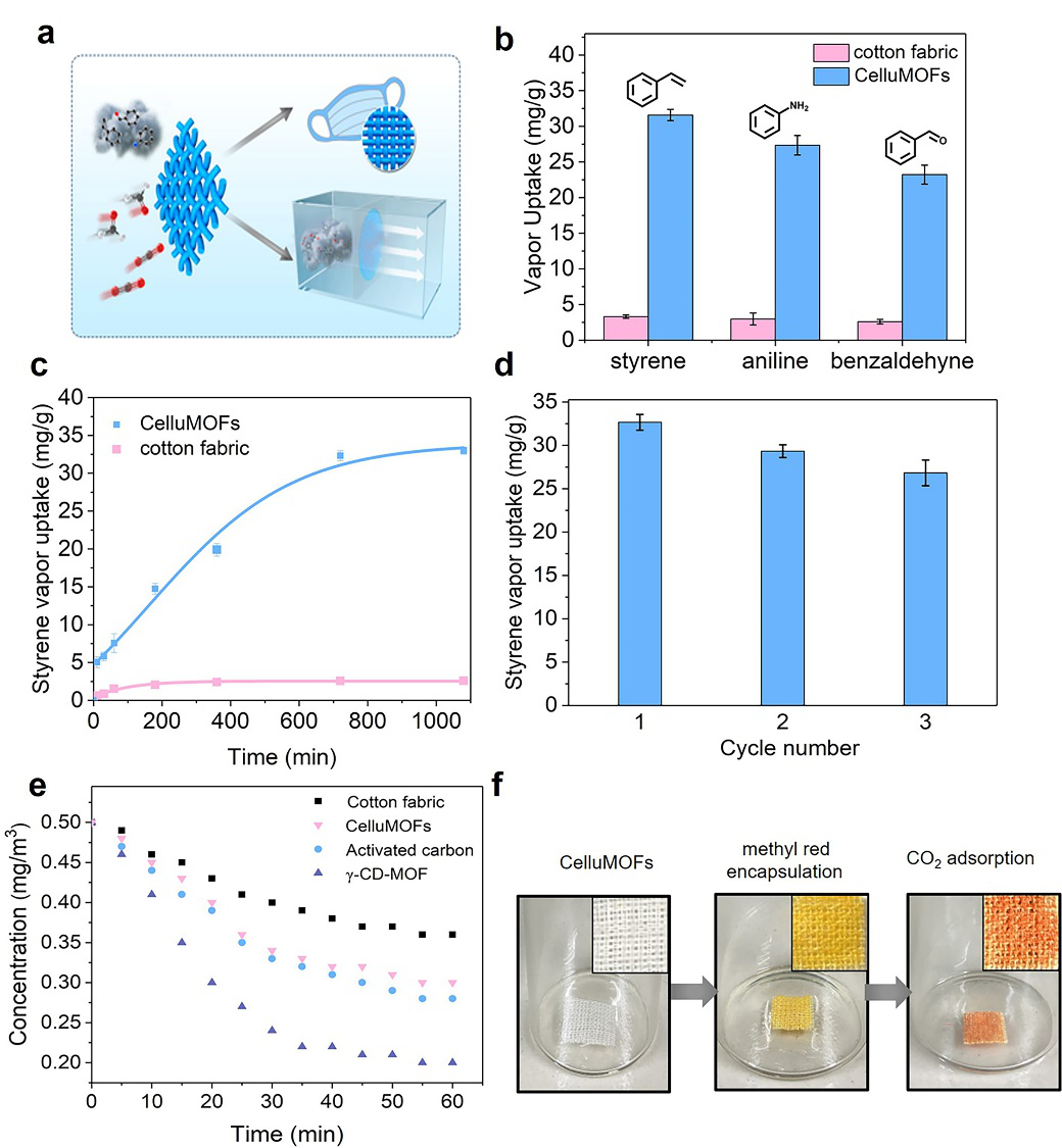 ������՚�����O�䶼���b�w�S�����^�V�����Á���ȥ�՚����w����Ⱦ�PM2.5�����]�l���ЙC�����VOCs������ԭ�w�ȣ�Ȼ��������w�S�^�V�����^�Ϳ�϶�ʺ��^������������������^�VЧ���^�͡������������Mһ����̽����CelluMOFs�����^�V���ό����w��Ⱦ���������r���D5a�����о��Y���@ʾ��CelluMOFs��VOCs������ϩ������������ȩ���������������_22.5-32.7 mg/g ���D5b����CelluMOFs������ϩ�����ٶ��^�죬10 h�ȼ����_������������D5c����CelluMOFs߀����ͨ�^�״��M��Ó������ѭ�hʹ���^�����Ա����^�ߵ������������D5d�������⣬���ڦ�-CD-MOFs�ͼ�ȩ֮�g�Ě��I�������w����ã�CelluMOFs����-CD-MOFs ~17 wt.%������ȩ���_�������ۻ���̿���Ƶ������������D5e�����c��-CD-MOFs ��ƣ�CelluMOFs��CO2Ҳ�����^�ߵ��������������t����ָʾ�������d�ڦ�-CD-MOFs�Ŀ�ǻ�У��ڸߝ�ȵ�CO2 �����Sɫ׃���ɫ���D5f����CelluMOFs ��VOCs��CO2 �����^���������������@�N�����w�S�����ڿ՚�����ͭh�����o�I�������V���đ���ǰ����