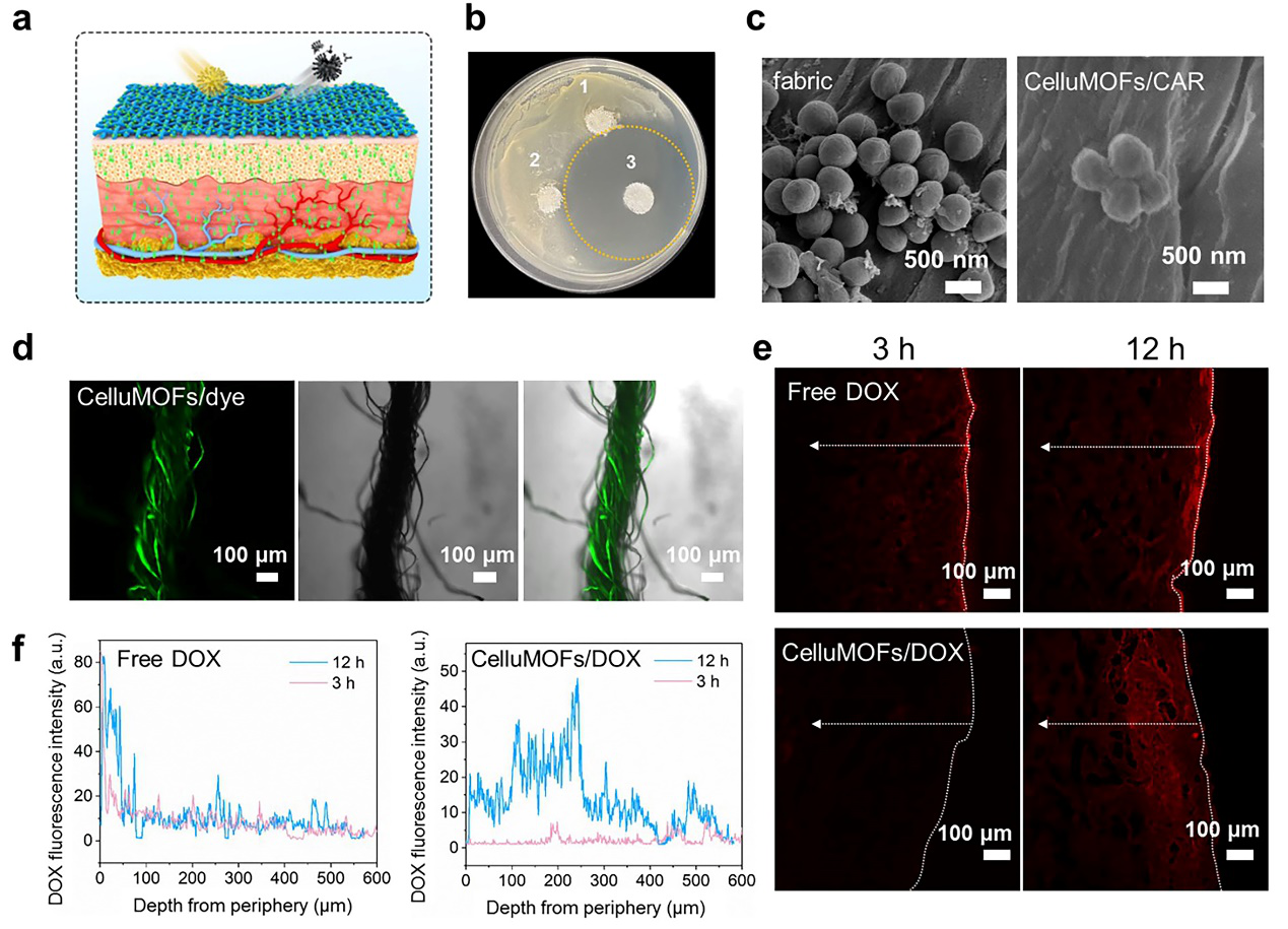 �w�S�����������t�ü���Ʒ�I��Ҳ�l�]����Ҫ���ã������^�m̽����CelluMOFs �ڿ�����ˎ��ݔ���I��đ��ã��D6a����CelluMOFs���d���������۷Ӻ����m����Ծ�����������m����Ծ����c�U���������@���־����ã��D6b����SEM�D�^�쵽�cCelluMOFs�����B�ļ������F���@���s׃�Σ����c��ͨ�������B�ļ������ܵطֲ��������棨�D6c�������⣬CelluMOFs���d����ˎ�ﰢù�أ�DOX�����Á��о�ˎ��Ľ�Ƥ�oˎ��CelluMOFs/DOX�� DOX��ĩ�քe����ظ��w���iƤ���棬ȡ3 h ��12 h�ĕr�g�c��Ƥ�w�M�����������Ƭ���ü���۽��@�R�^��ˎ����Ƥ�w�M���НB��r��CelluMOFs/DOX�M�е�DOX�B�ٶ��^���ҷֲ��^�������_��������ί�Ч����ͬ�r���⼱�Զ��ԣ��D6d-f�����о��Y��������CelluMOFs������Ч���F���m����Ƥ�w�oˎ���������t�ü���Ʒ�I���о�����