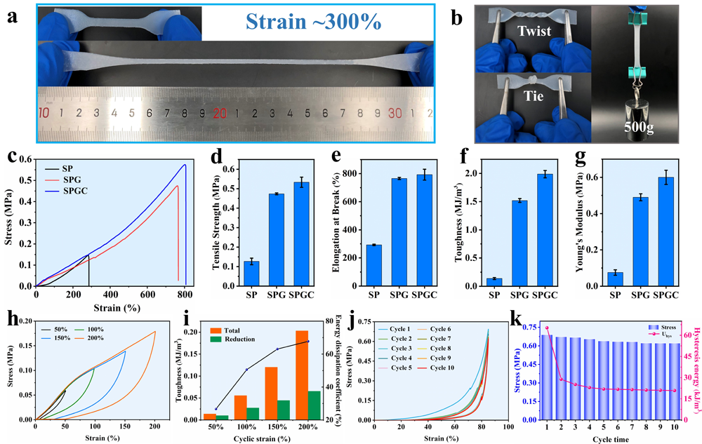 ����PVA�����ۡ����ͺ�ˮ֮�g�Ě��I�����Լ�CaCl2�c����朵��������ã�SPGC�ЙC���z�ęCе�����@����ߡ��S�����ͺ�CaCl2�ļ��룬�ЙC���z�����쏊�Ⱥ͔������L�ʏ�0.13��0.02 MPa��292��5%���ӵ�0.53��0.03 MPa��793��39%���S��ͨ�^һϵ��ѭ�h�yԇ����SPGC�ЙC���z�������õĻ؏����ܡ�
