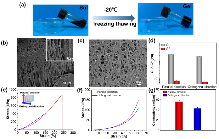 �D2. a)���z-���z�D׃��b)���ˮ���z�M�����SEM�D��c)SEM�D��ĸ�ҕ�D��d)MXene���ˮ���z��ƽ�кʹ�ֱ�W�j����Ĵ惦ģ���͓p��ģ����e)���쑪��-��׃������f)����-��׃������g)늌��ʡ�