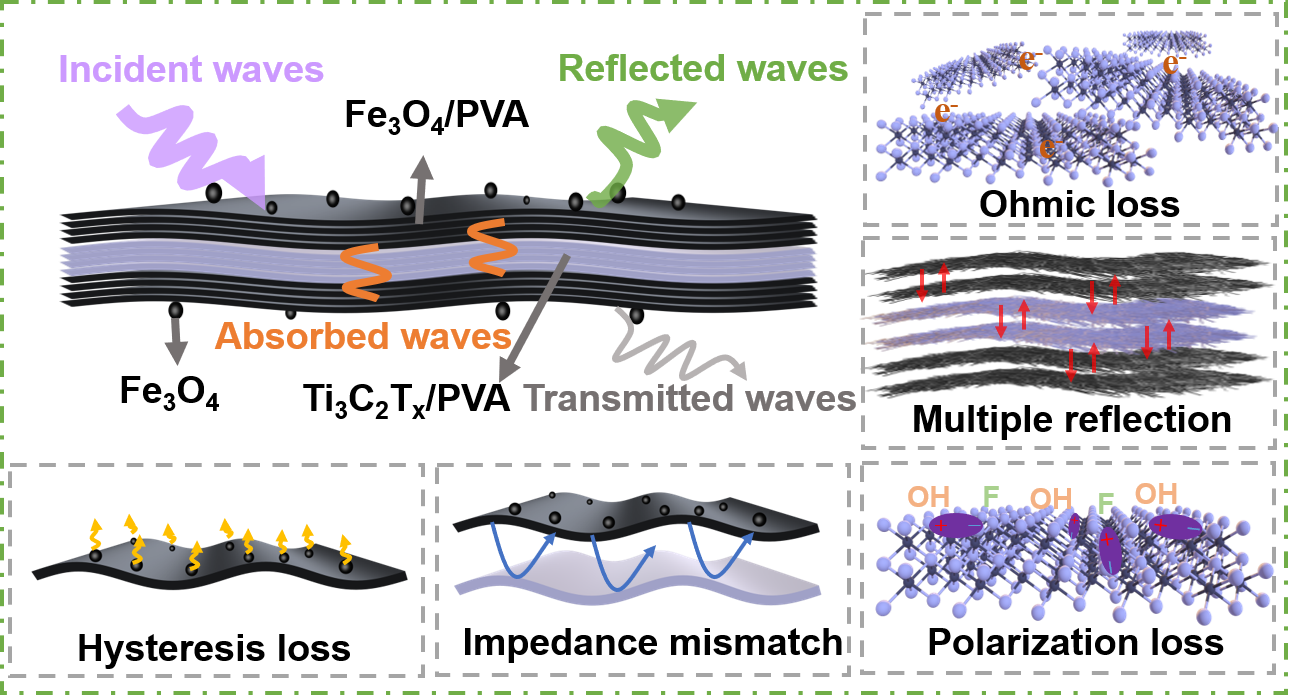 �����SFPC�n�}�M2020����ʿ�о���������ͬ�W�������o늼��z-䁌�-�ቺ����ˇ�Ƃ������Ӟ�Fe3O4/����ϩ����PVA���ͺ�늼��w�S�����g�Ӟ�Ti3C2Tx/PVA�ͺ�늼��w�S�������νY(ji��)��(g��u)늴����Ώͺ�Ĥ���o늼��z��ˇ��ʹFe3O4��Ti3C2Tx��PVA늼��w�S�ď������У����������ӌ��š�����Լ�����ͨ·�γɵĿ����ԡ����´��Ԍӡ����g��늌ӵ������νY(ji��)��(g��u)ʹ늴Ų��ڏͺ�Ĥ�н�(j��ng)�v������-����-�����ա����^�̣���ʹFe3O4��Ti3C2Tx����Ч�����ߣ����������νY(ji��)��(g��u)늴����Ώͺ�Ĥ��늴Ų��ĴŜ��p�ģ������������^��Ti3C2Tx������Ѹ�ٌ��F(xi��n)��������늡�����ͨ·�ĸ�Ч����������o늼��z��ˇ�c�����νY(ji��)��(g��u)�ă�(y��u)���O(sh��)Ӌ��(g��u)������Ti3C2Tx������13.3 wt%��Fe3O4������26.7 wt%�r�������νY(ji��)��(g��u)늴����Ώͺ�Ĥ��75 ��m����µ�늴�����Ч�ܣ�EMI SE����40 dB��������ͬ���������»��ڹ���-�o늼��z-�ቺ��ˇ�Ƃ��늴����Ώͺ�Ĥ��21 dB�������������νY(ji��)��(g��u)늴����Ώͺ�Ĥ߀���Ѓ�(y��u)���Č������ܣ�����ϵ��(sh��)�˺͟�Uɢϵ��(sh��)���քe��2.86 W/(m·K)��2.43 mm2/s�������W���ܣ����쏊�ȡ��g�Ժ͗���ģ���քe���_27.7 MPa��6 MJ/m3��8.27 GPa����