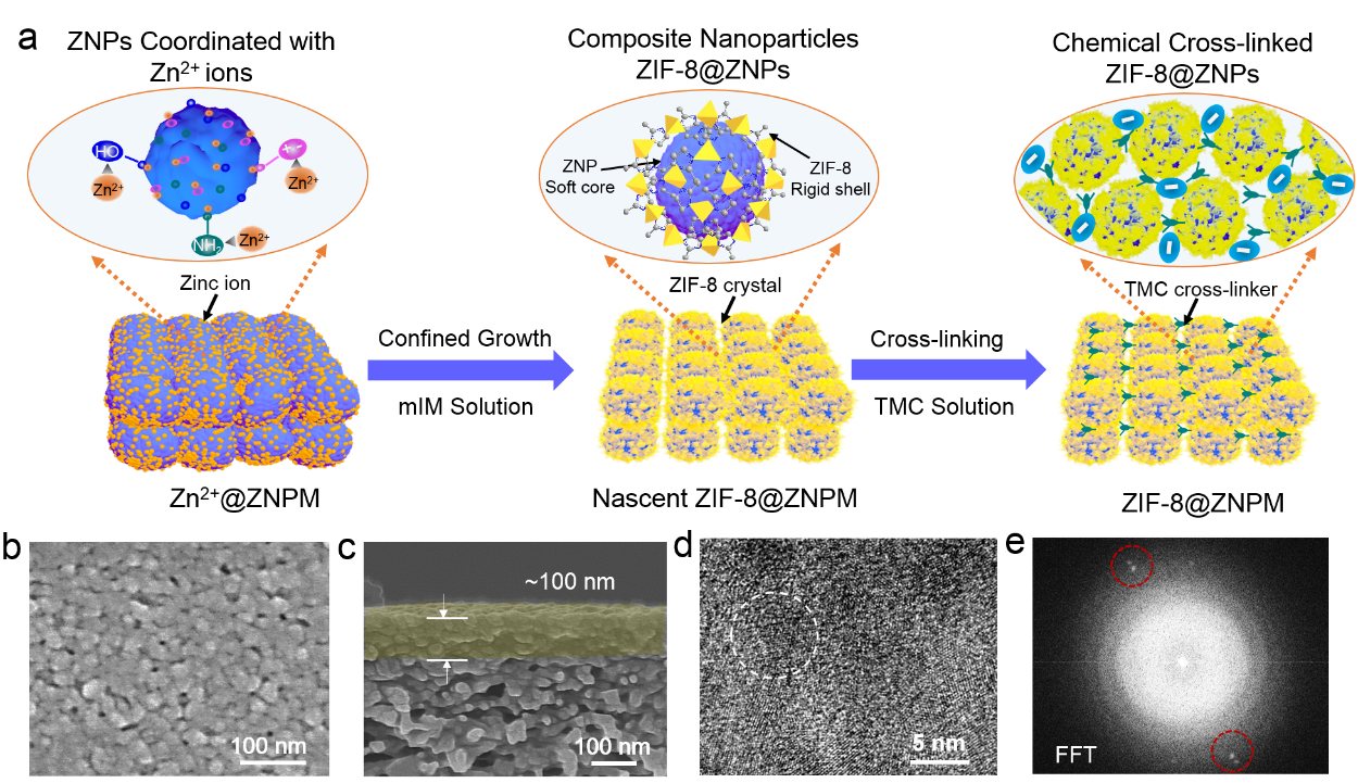 �D1. ZIF-8@ZNPM�{�����wĤ�Ƃ�ͱ�����(a) ��Ĥ��ˇʾ��D����ZNPs�cZn2+��λ�ԽM�b��Zn2+@ZNPMģ�������g��Zn2+@ZNPM����mIM��Һ���γɳ����B(t��i)ĤZIF-8@ZNPM���ң�ZIF-8@ZNPM�cTMC��(li��n)�M(j��n)�к�̎����(b, c) ZIF-8@ZNPM����͔���SEM�D������PSF-UF���֧�Ό��τ��x����֧��ZIF-8@ZNPM (d) HR-TEM�D���(e) FFT�����D����