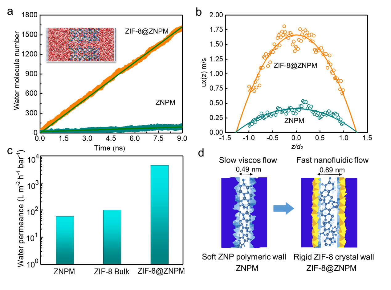 ���÷�ƽ����ӄ�(d��ng)���W(xu��)ģ�M������ZIF-8@ZNPMĤ��(n��i)���w���|(zh��)�О����y(c��)ԇ�^(gu��)����ZNPM���Ծۺ���{��ԪĤ�װl(f��)�����@��׃��Ȼ��ZIF-8@ZNPMĤ�ļ{��ʼ�K���ֽY(ji��)��(g��u)��(w��n)����ˮ������ZIF-8@ZNPMĤ�{�׃�(n��i)�Ă�ݔ���ʸ��_(d��)��~41.7 molecules.nm-2.ns-1�����^���Ծۺ���{��ԪĤZNPM��~0.5 molecules.nm-2.ns-1������>80�����c�īI(xi��n)��(b��o)����̼�{��ˮ��ݔ�����ஔ(d��ng)���D3����ZIF-8�ڃ��Ծۺ���{�����ӽ���̎�������L(zh��ng)������Ч����(qi��ng)�{��ͨ����Ӳ�����γɼ{�����w�����ݔ�����Ӽ{�׳ߴ���Bͨ�Կ����M(j��n)һ����(qi��ng)�����|(zh��)��