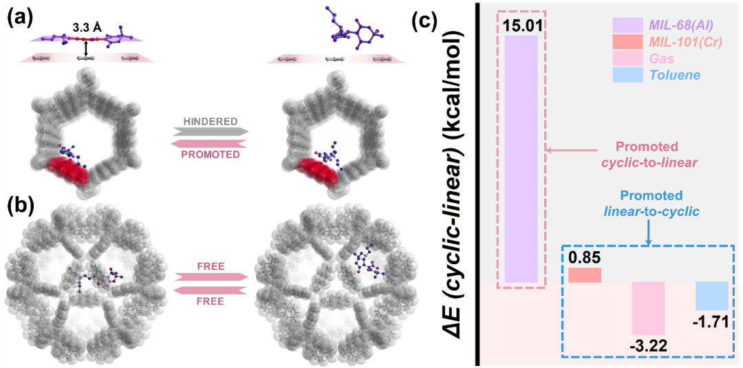 �D3. (a) DASA-1��MIL-68(Al)�{�\�еĻ��W(xu��)�Y(ji��)��(g��u)��픲���DASA-1�cMIL-68(Al)�б��h(hu��n)ƽ�������(du��)λ��;(b) DASA-1��MIL-101(Cr)�{�\�еĻ��W(xu��)�Y(ji��)��(g��u);(c) cyclic DASA-1 ��linear DASA-1��MIL-68(Al)(��ɫ)��MIL-101(Cr)(�tɫ)������(��ɫ)�ͼױ�(�{(l��n)ɫ)�е�����(du��)�����E��