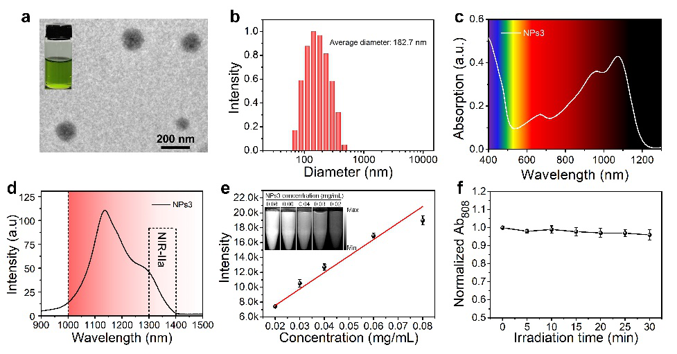 ԓ�F��Mһ�����ɹ�������ľۺ��P3�����ü{���������Ƃ��ˮ���Լ{��̽ᘣ�NPs3�������о���ԓ̽ᘵğɹ⡢������ܡ��Y��������NPs3����Ҏ����������ò��ƽ��ֱ��182.7�{�ף��ڽ��t��һ�^�Ͷ��^�����^�������ա��ɹ�yԇ�������{��̽ᘵİl�䷶����ȫ���ڽ��t����^������NIR-IIa�^���к��İl�䡣��1064�{���������£�NPs3��0.06 mg/mL����������ߜضȿ��_65�棬�ҹ���D�QЧ���_33.42%��