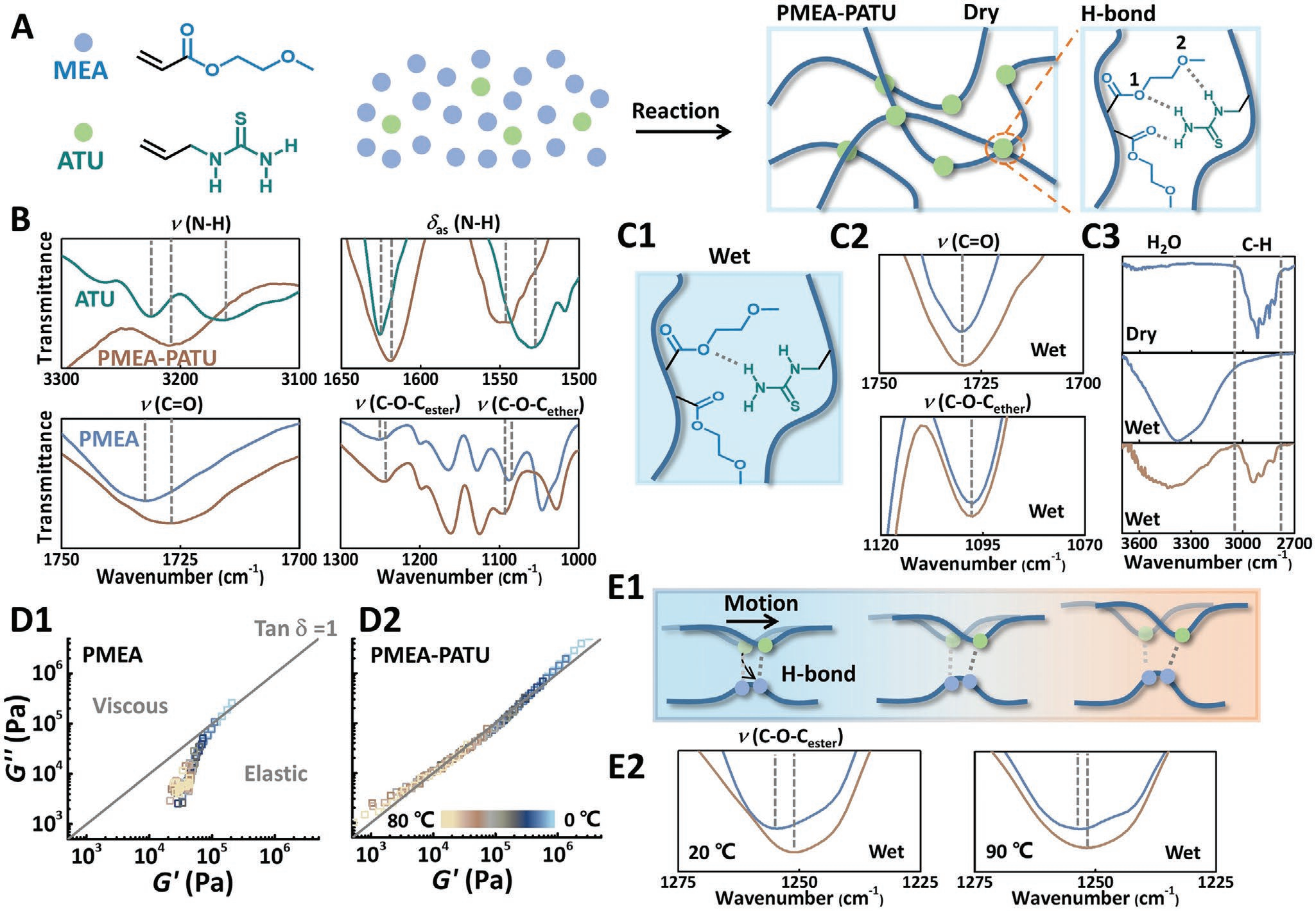 ͨ�^�r�g-�ضȵ�Ч�B�ӵõ�PMEA-PATU����������ԓ�������Ѓ���ģ��G���c�p��ģ��G�����10-5-103 Hz�Č��l�ʷ�������ӽ���б�ʞ�0.5�����Ͼ���Rouseģ�ͣ�G�� = G��� ~ f0.5���f�����ڴ��ڿ���ķ���朾��ϣ����ֵ�朶�Rouse�����W���p���������ھۣ���2-�������������һ���ϩ����-N-ϩ�������壩��PEEEA-PATU���;ۣ���ϩ�ᶡ��-N-ϩ�������壩��PBA-PATU���@�ɷN��ϩ����-���干��������^�쵽�_ʼ���ӵ������r�g�քe��1 s��0.1 s�����r�g�����_ʼ���ӵ������r�g�r��PEEEA-PATU�cPBA-PATU�ēp��ģ��G�����ڃ���ģ��G�䣬����ƫ�x����Rouseģ��G�� = G��� ~ f0.5������PEEEA-PATU���f���^�L�Ă�朕��γ��ų��w�eЧ�����p������朵ľ������ã��M��EEEA��Ԫ�cATU��Ԫ֮�g�����γɚ��I����á�������PBA-PATU���f��BA��Ԫ�cATU��Ԫ֮�gδ���γɚ��I���p���˷���朵ľ������á����N��������10 �浽90 ��ı��^��ܷքe��112-93 kJ/mol��100-48 kJ/mol��64-41 kJ/mol��ͬһ�ض��£�PMEA-ATU�ı��^���ʼ�K����PEEEA-PATU��PBA-PATU���f��PMEA-ATU�Ĝض����жȸ���PEEEA-PATU��PBA-PATU����������ͬ�ĜضȺ��l���µ�����Ï���PEEEA-PATU��PBA-PATU��