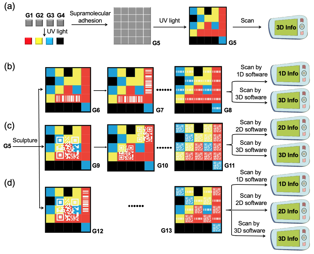 ���ھ���ϩ��ˮ���z����Ě��I��G1,G2,G3,G4���ԽM�b��ˮ���zG5�����ڟɹ����AIE-R��AIE-Y��AIE-B�����룬ʹ�ýM�b�wG5������������³ʬF��N�ɹ��ɫ����D2a���� ���S��һ�S�a����S�a�D�������뵽G5�Еr�����H���Դ惦һ�N3D��Ϣ�����ҿ��Դ惦������һ�S����S��Ϣ����ˣ���Codes in Code���������ʂ����Ϣ�a���Դ惦��������Ϣ����D2b-2d����