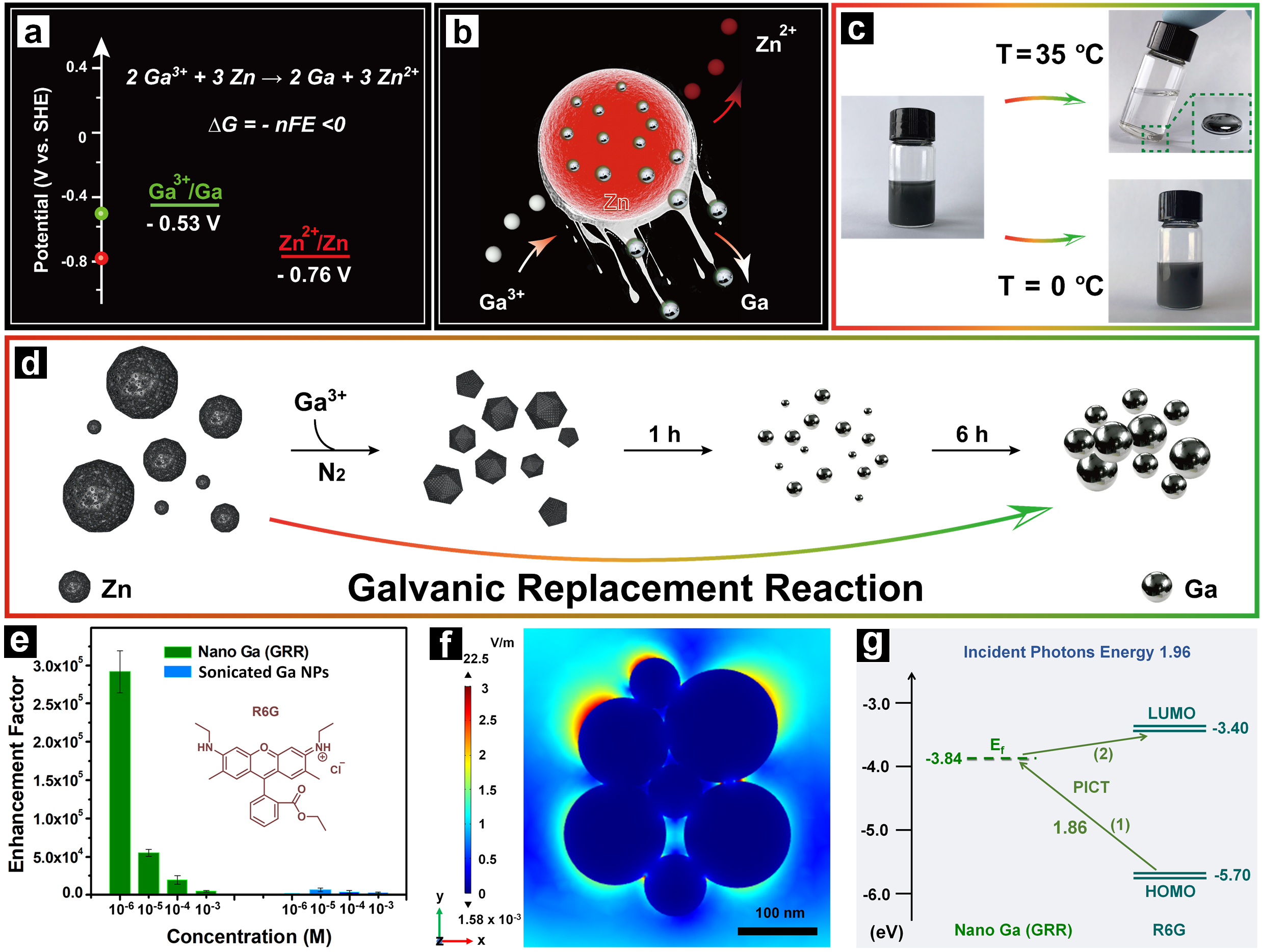 �D2.��a�������\��扵Ę�(bi��o)��(zh��n)늘O�λ�D����b�� Ga3+��Zn NPs֮�g����(y��ng)��ʾ��D����c�� �ڲ�ͬ�ض��£�35 ��C and 0 ��C���M(j��n)��GRR֮ǰ����Zn NPs��GaCl3�Ĝ���Ҹ�Һ����֮���ң��Ę�Ʒ��Ƭ����d��Zn��Ga3+֮�g��ͬ����(y��ng)�r(sh��)�g��GRRʾ��D����d�����^R6G�ڼ{��Ga��GRR���ͳ�̎����Ga NPs�ϵ���������(qi��ng)���ӡ���e����FDTDģ�M�ļ{��Ga��GRR���ľֲ�늈�(ch��ng)�ֲ��D����f���{��Ga���M(f��i)���ܼ�(j��)�cR6G���ӵ�HOMO��LUMO�ܼ�(j��)֮�g��PICT�^�̡�