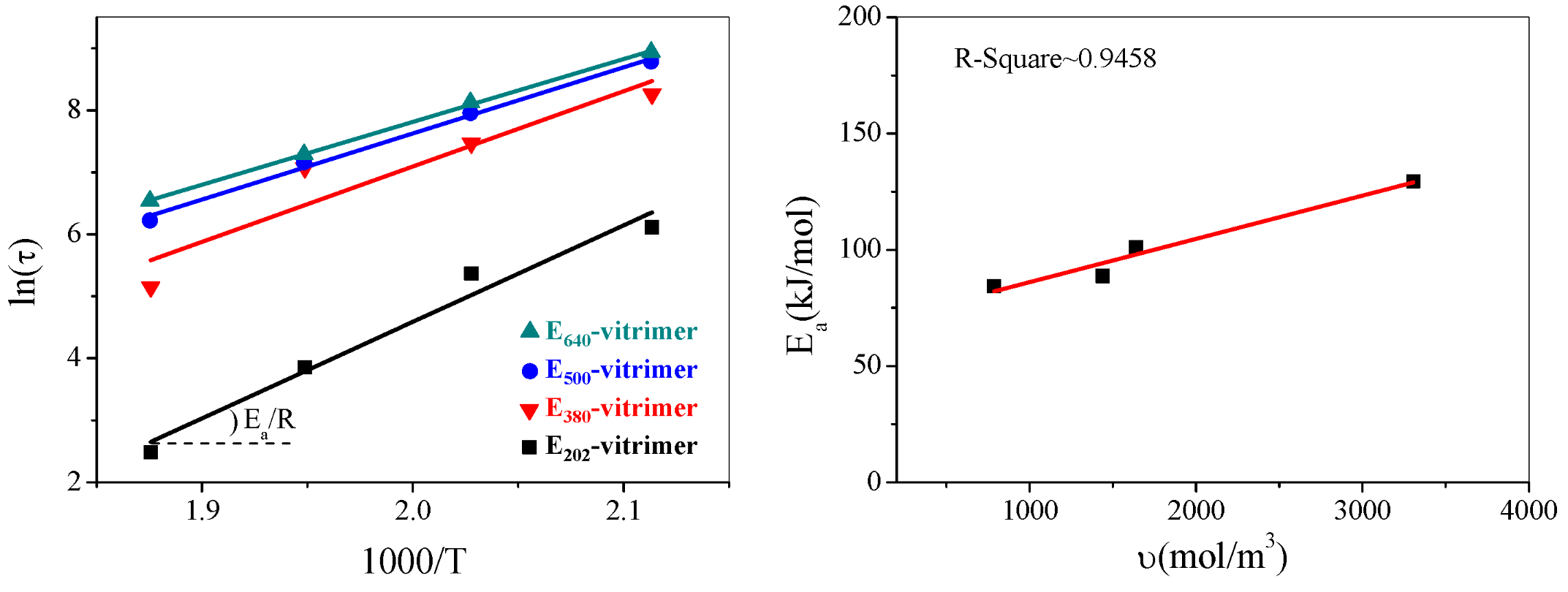 ������֪���h��vitrimer�đ����ɳڕr�g�������Ea��ָǰ������0�͟����W�ض�T��ѭ�������˹���̣�����1�������ͨ�^��ͬ�ض��µ���������Ӌ��õ�Ea����0������Ea�����h��vitrimer�����ɳ��О���Ȍ��ضȵ������ԣ������o�ߜض��£�T=+�����đ����ɳڕr�g���@�ɂ�������ͬ�Q���˭h��vitrimer�đ����ɳ��О飬��ͬ������ӑB���ܡ�