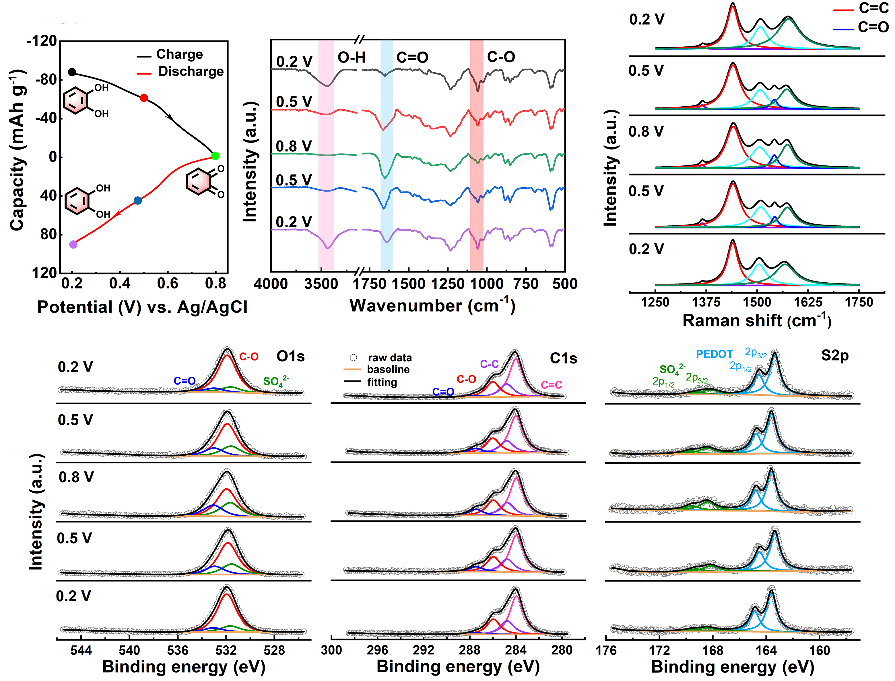 ���@헹����У�����ʹ�û��ڃ���ӵľۺ������O�c���������ľۺ���ؓ�O�_�l(f��)��һ�N���Ѓ�(y��u)��늻��W���ܵ�ȫ�ۺ���ˮϵ�|(zh��)��늳ء���ԭλ���V��FT-IR, Raman��XPS���C���˃�����ڳ��늲�ͬ�A����C-OH�cC=O�Ŀ���׃�����Լ�PEDOT��朵���x��Ƕ���^�̣��D2�����Y(ji��)��DFT��ՓӋ�㣬ͨ�^������ӻ��F����PEDOT�Ǽܣ��a(ch��n)���@��������x������߀ԭ��(c��)���c��ܗ�Ǽܵ�����Ʒ��x�����ڌ��F(xi��n)�I���늺ɴ惦���Ķ����F(xi��n)��(y��u)���ı������ܡ����⣬�ʻ�λ�õ���ԭ���o늄��ܞ�ؓ���������Џ��Ľo����������Y(ji��)���|(zh��)�ӣ��D3����ͨ�^��ԭλ�V�W������DFTӋ������ˌ�����ʽ�ۺ���늘O���|(zh��)�Ӵ惦�C�Ƶ����⣬ͻ���˺����OӋ�����ܾۺ���늘O���ڿɳ��m(x��)����ϵ�y(t��ng)�ĵĿ����ԡ�