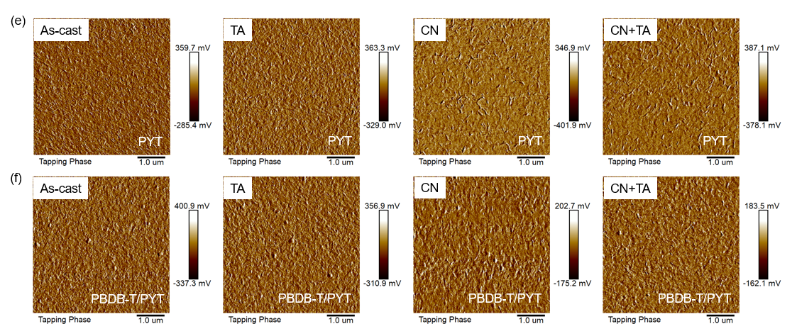 �D2. a)��ͬ�ӹ��l����PBDB-T/PYT��Ĥ��2D GIWAXs�D��b-d)1D GIWAXs�D����ͬ�ӹ��l����e)PYT��Ĥ��f)PBDB-T/PYT��Ĥ��AFM���D��