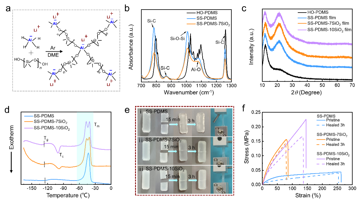 ���ڣ��п�Ժ�{����Դ�����V����W�����о��T�n�}�M�OӋ���Ƃ��˻��ڄӑB���۶���������ĸ������������͆��x�ӌ�늵��˹�SEIĤ��SS-ASEI������ͨ�^����һ������SiO2�{���w�������������Mһ�����������ܡ���SEIĤ�������ׂ����ݣ��D1������1��ԓ�ۺ���SS-ASEI���Ժ������γ�һ�Ӿ���ı�Ĥ�����ؓ�O�ṩ�������o�������ƿ��ܵ�֦�����L; ��2������SS-ASEIĤ�ۺ���W�j�Ў�ؓ늺ɵĻ��F�������x���Եش��MLi+�x�ӵ��w�ƶ�������x�ӵ��w��; ��3����ߵď���׃����������ʹ���ڷǾ��|��Li���L������^��ֲ���׃��Ҳ�ܱ��C������|���H�ܺ�������; ��4�����L�r�gѭ�h��l���p���r����˲�g�����������Mһ�������ޏͿ��ܵ��Ѽy���@Щ�fͬ���ÿ��Դ��MLi��/���x�ľ����S�ַ�����ASEI�����L����������Li֦�����L�������к��ĸ���������7 wt% SiO2������SS-ASEIĤ���Ѓ��������ܣ�����96%�����ޏ�Ч�ʡ�0.13×10-4 S cm-1���x��늌��ʺ�0.71����x���D�Ɣ����D2�͈D3�������@�NSS-ASEIĤ����䇽���ؓ�O����0.5 mA cm-2��1.0 mAh cm-2�£�������1340 h�Ȍ��F���^���������/���x���D4�������Ժ���ؓ�O�c����NCM811 (LiNi0.8Co0.1Mn0.1O2)ؓ�O�M�b��늳ؾ��Ѓ����ı������ܺ�ѭ�h���ܣ��D5�����@�N�Ƃ䷀��䇽���ؓ�O�Ŀ����Է�����δ���������ܶ�䇽���늳ص��̘I��չʾ�˾�����ԓ�����ԡ�Self-Healing Single-Ion-Conductive Artificial Polymeric Solid Electrolyte Interphases for Stable Lithium Metal Anodes�����}�l���ڡ�Nano Energy���ϡ����µĵ�һ�������п�Ժ�{����Դ���͏V����W�����B�IJ�ʿ����������ԓ�о��õ�������Ȼ�ƌW����ί��֧�֡�