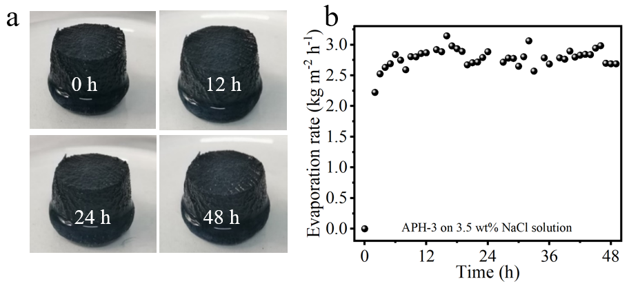 APH���ж�Y(ji��)��(g��u)����380-2500 nm������(n��i)��̫ꖹ�����Ч�ʸ��_(d��)95.5%����ˮ�����APH�еĽ���ˮ���l(f��)�ʃH��1624.14 kJ kg-1�����@���ڼ�ˮ�����l(f��)��(2418.11 kJ kg-1)����Ҫ������PEDOT:PSS�е�SO3-��PVA�Ǽ��д���OH-���cˮ���Ӱl(f��)�����ã���(d��o)�����gˮ/����ˮ���ʸ��_(d��)2.27:1����ģ�M̫ꖹ�(1.0 kW m-2)�������£�APH�����l(f��)���ʸ��_(d��)2.5 kg m-2 h-1 (�D2)����ˮ���l(f��)Ч�ʞ�90.7%����Ҫ���ǣ�APH�е���x�ӻ��F(tu��n)(����SO3-)���ų⺣ˮ�е���x��(����Cl-)����Ч�����������l(f��)�������}(�D3)�������L�ڸ�Ч�����l(f��)��ˮ��