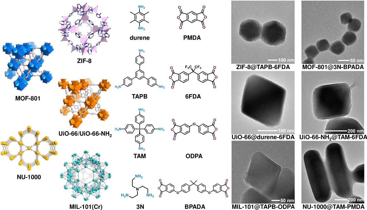 ��һ�NZr��MOF��MOF-801������ͨ�^NISAP��ԓMOF�������һ��sub-10 nm���ҘO������PI�ۺ���������@��MOF-801@PI�˚��w��������X�侀���V������EDS����C�˾ۺ�����浪Ԫ�غͷ�Ԫ�صij��F���քe�����ڱ���ۺϵĶ�Ԫ�����w���͎��з�Ԫ�صĶ������w���t����V��1785 cm-1���������@ʾ�ˆ��w�g�����õ������������F�Ĵ��ڣ��C���ˆ��w�ijɹ��ۺϡ�����˼������MOF-801@PI�ͺϲ��ϵĵ�������������MOF���|��ռ�Țwһ�����c��MOF��һ�����f�������������ӌ�MOF�Ŀ�϶�ʲ��oӰ푣�ֻ������MOF���棨�D2�����Mһ����MOF-801��Q��������͵�MOF������ZIF-8��UiO-66��NU-1000��MIL-101(Cr)��ͬ�r����ͬ�Ķష�Ͷ������M�нM�ϡ����߳ɹ��ث@����6�N����MOF@PI�˚��Y���ďͺ��w�����D3�����@Ҳ�Mһ���C����ԓ�������и߶ȵ����m�ԡ�