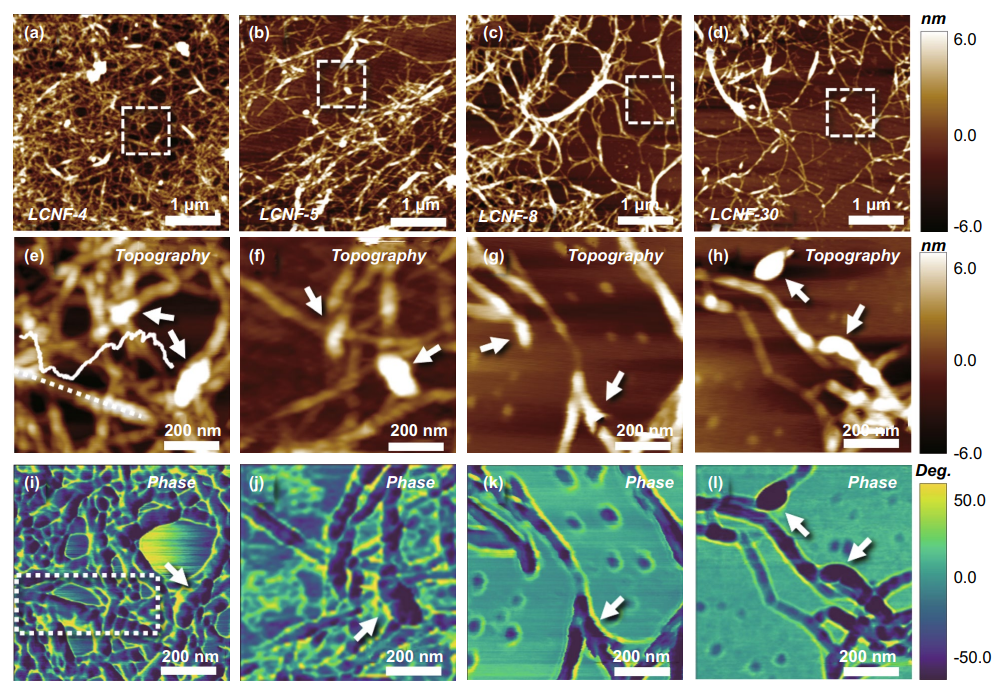 �D1. (a-h) ��ͬ�Ŵ���LCNF��AFM�߶ȈD��(i-l) LCNF��AFM��λ�D��