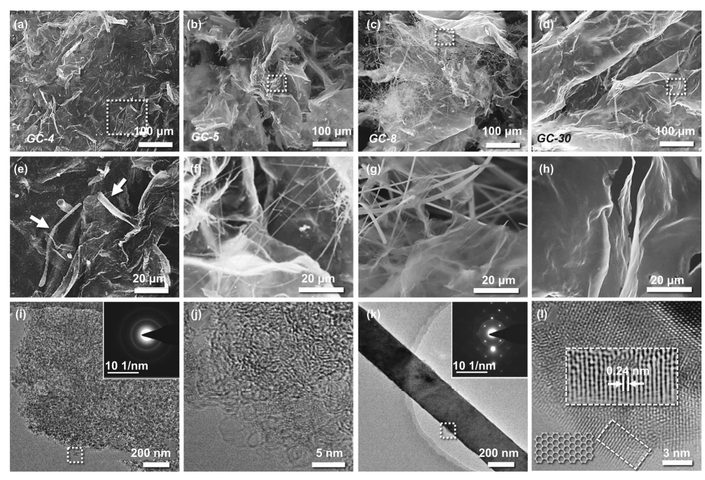 �D2. (a-d) GCs��FE-SEM�D���������Ŵ�D(e-h)��(i-l) �����Լ{��Ƭ�ͼ{���ĸ߷ֱ�TEM�D���Լ�SEAD�D��