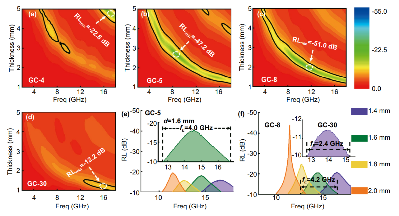 ԓ����ͨ�^��������ľ�|�w�S�ؼ{���w�S�ğ��ϳ��ɼ{���w�S�ͼ{��Ƭ�M�ɵ�ʯī��̼ (GC) �����|�Y����ͨ�^���{�Y���Π���r�I�Ŀ������Ƃ��һ�N��Ч��늴Ų����Մ����{���w�S���cľ�|�ر��ʞ� 8:1�r��ʯī��̼����������Ч�����l�����ȿ��_4.2 GHz��������12.5 �� 16.7 GHz����ͬ�r��11.7 GHz̎��������͵ķ���p��ֵ(RLmin,-51.0 dB)�����ƥ���� (1.95 mm)�����⣬�����|������̼���ϱ��F����������ˮ�ԣ�ˮ�ı��^���|�ǿ��_ 135 ��)������/�A�ԡ����w�������@헹����Ј���ĽY����һ����������|������늴����Մ��ṩ���OӋԭ�t��
