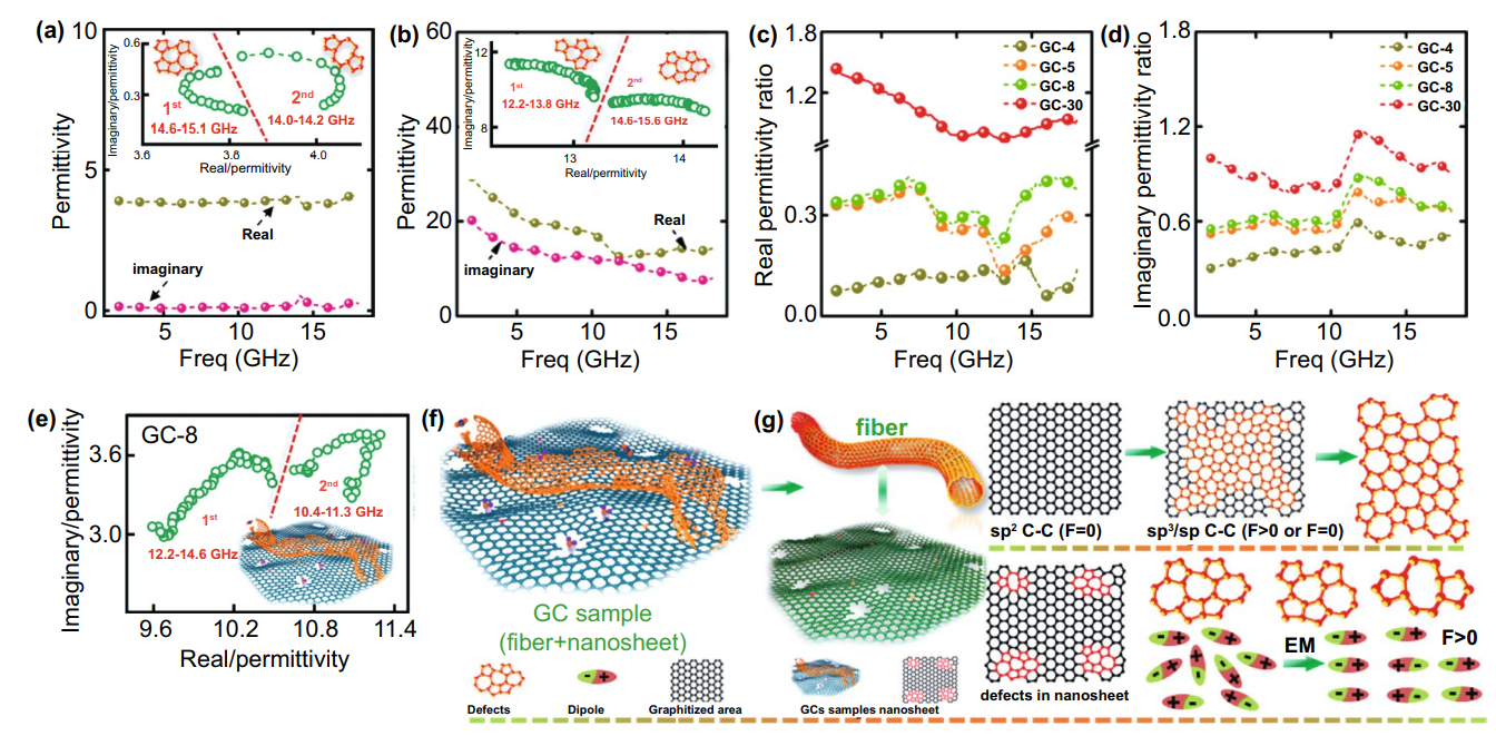 �D5. (a, b) ��ľ�|�غ��w�S��̼����Ľ�늳�����������D�@ʾ������Cole-Cole�����D��(c, d) GCs�c���w�S��̼�Č���늳����Ⱥ�̓��늳����ȣ�(f, g) �O��-�Yԥ�^��ʾ��D��
