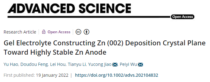 �����о��ɹ������ԡ�Gel Electrolyte Constructing Zn (002) Deposition Crystal Plane Toward Highly Stable Zn Anode�� ���}���l���ڡ�Advanced Science������Adv. Sci. 2022�� DOI: 10.1002/advs.202104832���ϡ��|�A��W���W�����c���﹤�̌WԺ�����������������о��T��Փ�Ĺ�ͬͨӍ���ߡ�