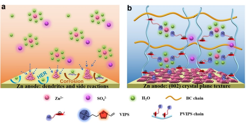 ���ڣ�ԓ�о��F�ͨ�^�������x�ӆ��w3-(1-vinyl-3-imidazolio) propanesulfonate ��VIPS�����뵽�����w�S�أ�BC�����W�j�У��_�l���Cе������������܈F�������������F�����������z늽��|��PZIB gel electrolyle����������߷��Ӿۺ�����܈F�{���\���e�ľ��wȡ���IJ��ԣ��ɹ��T��Zn2+�������L��o֦���Y�����c��Ҏ�β����{��늻��W�^�����\���w�ɺ˲��Բ�ͬ�����ܻ����������z늽��|���Զ��fͬ���F���\ؓ�O�ķ�����һ���棬���z늽��|�Ў�늻��F���H���\�x�ӵĸ�Ч�w�Ƙ���ͨ����߀���������\ؓ�O�Ľ���늈�������Zn2+�ij��e�����W���T��늻��W���e�^����Zn(002)���惞�����L����һ���棬Zn2+���܄����Y������늻��F�ؘ����Mһ��������ѭ�h�^���еĸ����������ڃ����x�ӎ�늹��܈F�ąfͬ�{�����ã�PZIB���z늽��|�Y���ṩ�˸��x��늌��ʣ�21.88 mS cm-1����Zn2+�w�Ɣ���0.74�����ڸ�����ܶ�7.5 mA cm-2�£�Zn/Zn늳���Ӌ�������_3000 mA h cm-2���@������Һ�B늽��|��Ŀǰ��������ڷ����\ؓ�O�IJ����������늻��W���ܡ�ͬ�r������PZIB���z늽��|�M�b���������������m���ڸ��N�Cе׃�β��ṩ�����ĸ�늻��W���ܡ��@헹�����늻��W�^�����{���\���e�ijɺ˾��w�ṩ���µ�Ҋ�⣬�����OӋ��ȫ�����á��ɴ����ĸ�����ˮϵ�\�������O���ṩ�µ�˼·��