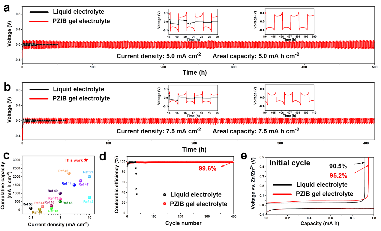 �����Mһ���C��PZIB���z늽��|���\�x��늳��ϵă�Խ�ԣ����x��늌��ʺ�Zn2+�w�Ɣ��M���˱�����PZIB���z늽��|���x��늌��ʺ��w�Ɣ���21.88 mS cm-1��0.74���h�h����Һ�w늽��|��9.75 mS cm-1��0.44�����@�w����PZIB���z늽��|��֦���������������ơ�PZIB���z늽��|�M�b��Zn/MnO2ȫ늳��չ�F�����^�ߵı������ܣ�1 C��2 C��5 C��10 C��20 C������ܶ��������քe�_����230��196��159��130��107 mA h g-1�����^������ѭ�h���ܣ�5 C, 150 mA h g-1�������⣬����Һ�B늽��|Zn/MnO2ȫ늳�ѭ�h���\ؓ�O�����@ʾ���@��֦���͡����\����������PZIB���z늽��|��ѭ�h���Znؓ�O�ʬF���o֦����002���档