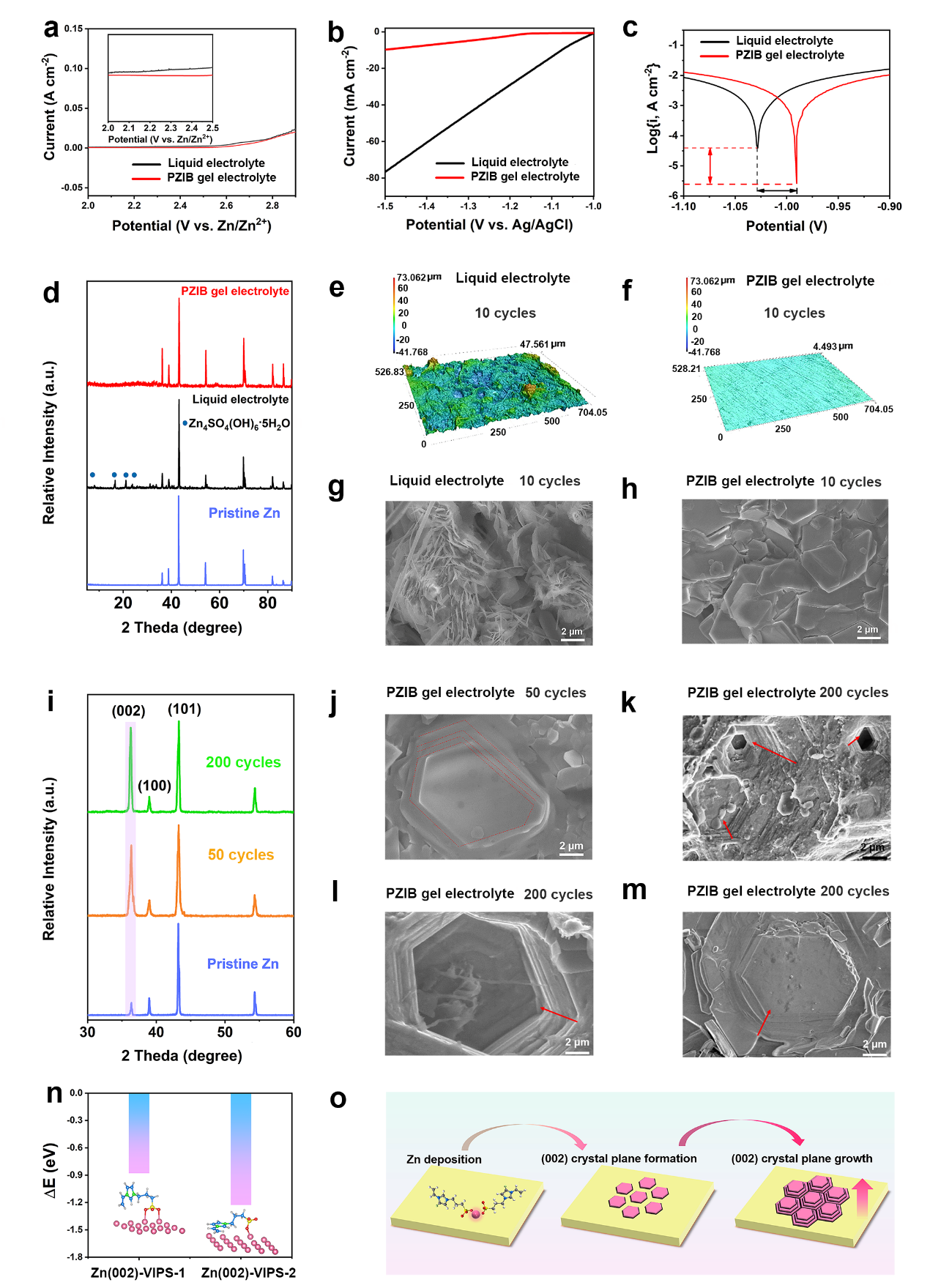 ����ͨ�^LSV��Tafel��XRD��SEM��DFT������̽��PZIB���z늽��|��֦���������������ƙC�ơ��cҺ�B늽��|��ȣ�PZIB���z늽��|չ�F�˸�����늻��W�������ڣ��f����PZIB���z늽��|�^�ߵ�늻��W�����ԡ�LSV��Tafel�yԇ�C����PZIB���z늽��|��늻��W�^�������䣨��푑���������Һ�B늽��|�������g���������߸��g�λ�����Һ�B늽��|�������ơ�XRD��ѭ�h�^����002����ķ���u��������SEM��ƽ�����L����߅�νY�����C����PZIB���z늽��|���Mѭ�h�^����Zn��002������ă������L�����F���\֦�����L�����ơ�DFT�Y������VIPS��������F�cSO3-���F�fͬ���M��002�������γɡ�