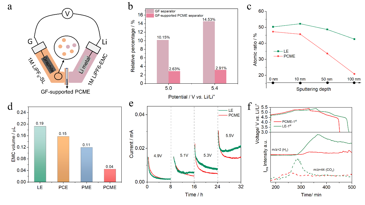 �D3 ��a��v��늽�ؼ���ԇ�ʾ��D����D��ʯī���O��늽�Һ��1M LiPF6/SL���҈D��䇽���ؓ�O��늽�Һ��1M LiPF6/EMC��v��늽����0.5 C�ı��ʹ���20�Σ��㉺���8 h��������ȡꎘOҺ�z�yEMC��������b��1H NMR�y�ò�ͬ늉��¼���ԇ�ꎘOҺ��EMC��Ħ����������c��ͨ�^XPS������늑B�ĸ߶�����ʯīƬ늘O�ڲ�ͬ��ȵ���Ԫ�طֲ�����d���߶�����ʯīƬ���O����ͬ늽��|��GC-MS�yԇ����e��ʯī���늳��У���ͬ늽�Һ��늻��W���ӌ��y��늽�Һ�����������ԡ���f��ԭλ늻��W�|�V������ͬ늽�Һ�Įa����r��