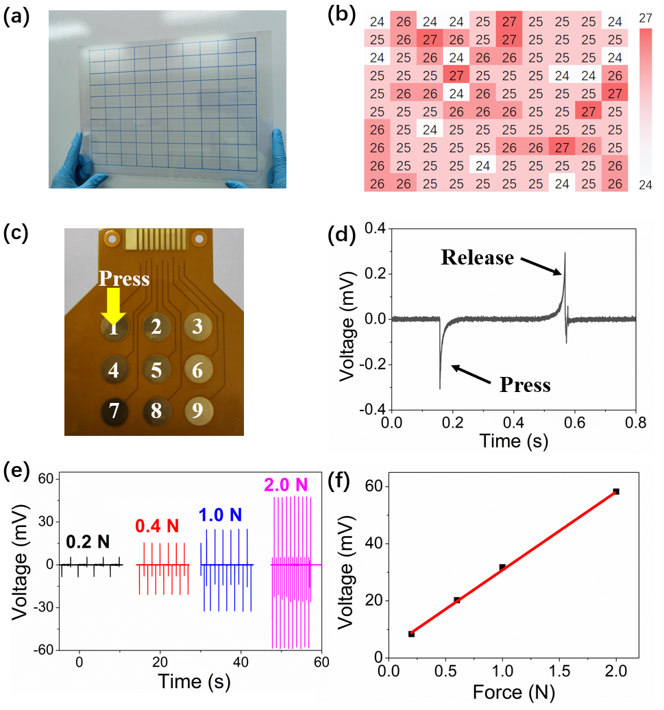 �D2. (a) ����ePVDF-TrFE/PI��Ĥ�Ĺ�W�D�� (b) �䌦���ĉ��ϵ����(c) PVDF-TrFE/PI������VTSES�ϵİ�����ጷ��\�ӣ��� (b) �����ĉ��푑�늉���̖��(e) ����늙Cʩ�ӵ�����С������ݔ���ĉ����̖�ď��ȣ��Լ� (f) ����֮�g�ľ����Pϵ��