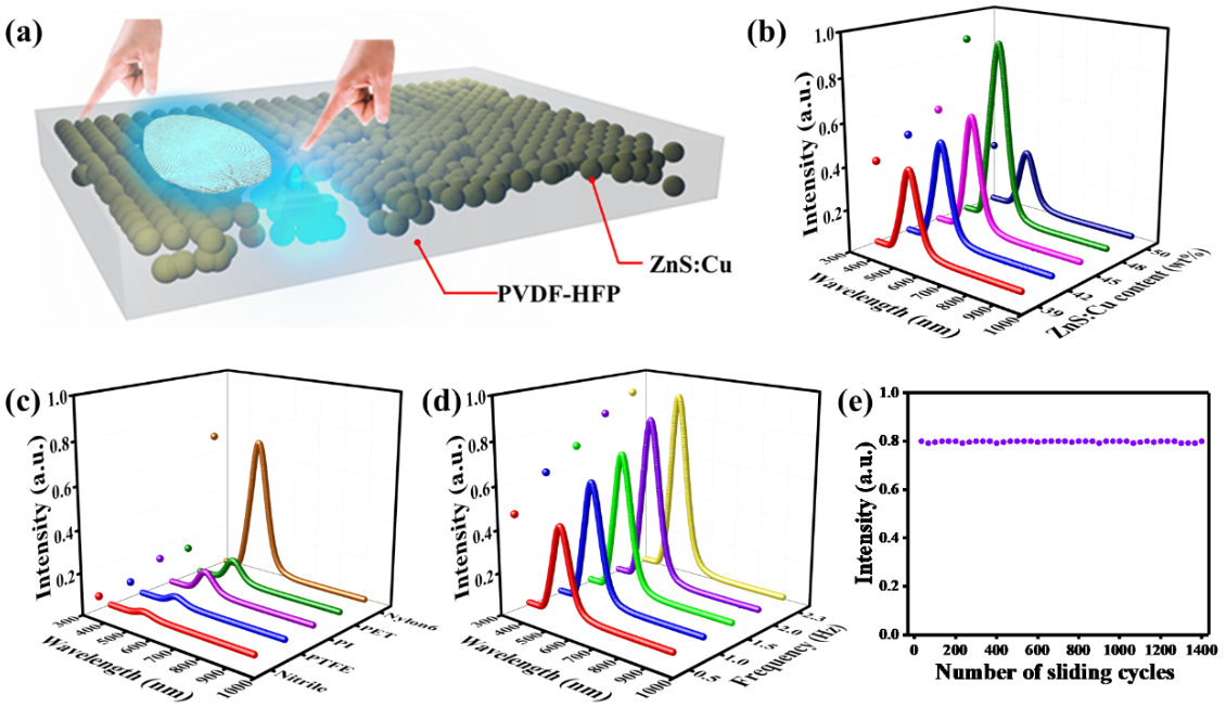 ���ڣ����ϴ�W�������ʡ���c��������½��ڈF������һ�N�����ȡ��߷ֱ��ʵ�����Ħ������T����°l��Ƥ�w��TIEL-skin�������F�ˌ��r������˙C��Ϣ��������ZnS:Cu�ɹ��Ƕ���ƫ����ϩ-������ϩ��PVDF-HFP���γ�ZEPH��Ĥ��ZEPH��Ĥ�İl�⏊���c��Ȳ�ZnS:Cu�ĺ���������Ħ�������Լ������l���������P����ZnS:Cu���|���֔���48%��Ħ�����Ϟ�nylon6�������l�ʞ�2.3 Hz�r�����F��ZEPH��Ĥ�����TIEL�l�����ܡ�ͬ�r��ZEPH��Ĥ���cnylon6���v1400�λ���ѭ�h֮����Ȼ�܉ַ����İl�⏊�ȣ������^�õ����ܷ����ԡ�����չʾZEPH��Ĥ�ĵ͉���푑������×l�����5 mm��nylon6Ĥһ���cZEPH��Ĥ�����p�p���|���ӣ��l�F��1.25 kPa�����¾��܉ӑB��������D���錍�rTIEL�l�⣬��D2a-c��ʾ����һ���棬������CTIEL�l�⏊�ȣ�ͨ�^�c2 Vֱ��늉��c���̘ILED�İl�⏊�Ȍ��ȣ��l�FTIEL�İl�⏊���ǾGɫLED�l�⏊�ȵ�2.5������D2d��ʾ��ͬ�r���ڰ�l���£�����Ҳ�܉F����ֱ���^�쵽TIEL�İl�⣬��D2e��ʾ���Mһ����C��ZEPH��Ĥ���Ѓ�Խ��TIEL�l�����ܡ����⣬ZEPH��Ĥ��TIEL���F���g�ֱ��ʞ�220 ��m��ָ�y������D2f-g��ʾ����ˣ�ZEPH��Ĥ��TIEL�������|�X�����Č��r��ҕ�������ṩ����һ�N������Ч�ķ�����ԓ�����ԡ�High-Brightness, High-Resolution, and Flexible Triboelectrification-Induced Electroluminescence Skin for Real-Time Imaging and Human�CMachine Information Interaction�����}�l���ڣ�Adv. Funct. Mater. 2022, 32, 2201292���ϡ����µĵ�һ�����Ǻ��ϴ�W�Tʿ�о����Z������ͨӍ�������������ڡ�ԓ�о��õ�������Ȼ�ƌW����ί��֧�֡�