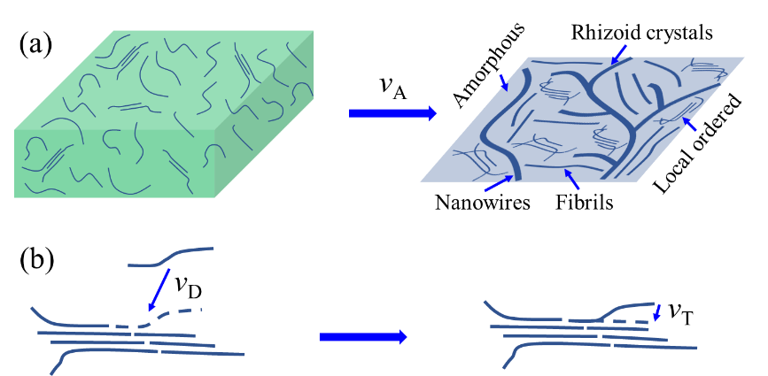 ��������˔Uɢ-��(g��u)���D(zhu��n)׃��D-CT����Փ�����D-A��ܗ�ۺ��ᄃ�w�����L�^�̡������J(r��n)�飬D-A��ܗ�ۺ���朶��ȏ���Һ�ДUɢ�����w���Lǰ�أ��S��ʣ��ľۺ���朶������Lǰ���M(j��n)�И�(g��u)���D(zhu��n)׃���γ���ֱ朘�(g��u)����D2��ʾ���������ƽ���ۼ��ٶȣ�vA����������λ�r�g��(n��i)����Һ�оۼ������ۼ��w���������w�͟o��ۼ��w���ϵľۺ���朵Ĕ�(sh��)������ƽ���Uɢ�ٶȣ�vD����������λ�r�g��(n��i)�܉�Uɢ�������w�����Lǰ�صľۺ���朶Δ�(sh��)������ƽ����(g��u)���D(zhu��n)׃�ٶȣ�vT����������λ�r�g��(n��i)�܉���ÿ�����w�����Lǰ���D(zhu��n)׃����ֱ朘�(g��u)��ľۺ���朵Ĕ�(sh��)�������o�����@�����ٶȵı��_(d��)ʽ��