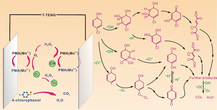ˮ���е��ЙC��Ⱦ������ĭh�����}���������{����������������ܵ�ȫ��������ĸ߶���ҕ�������������һ�N��ˮ�ӵ�Ħ���{�װl늙C��WD-TENG���������Թ��늻��Wϵ�y������4-�ȷӣ�4-CP����ȥ�������Ќ�WD-TENG�������늉�����ݔ���M�����о���߀ӑՓ��4-CP��ȥ�����併��C�ơ��Y��������WD-TENG�����f��/�^�����䣨PMA/H2O2���wϵ��ͨ�^���PMA��Mo5+�����D��Ч�ʁ����M�u�����ɻ���·OH�����γɣ��Ķ�ͨ�^�Ȼ����������Ì�4-CP�V������WD-TENG��늵��PMA/H2O2ϵ�y�У�120 min�Ȍ�4-CP��ȥ���������10%��ԓ�о�������Թ��늻��W�^��̎���h����Ⱦ���ṩ��һ�N��ǰ���ķ�����