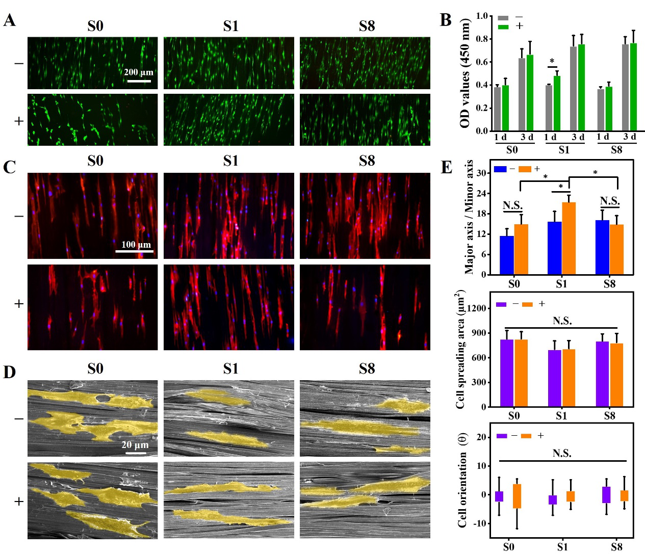�D3. ���W�����w�S�ļ��������ԙz�y�c��ò�^�죺��A����ͬ���W�����w�S�Ļ�/������Ⱦɫ����B����ͬ���W�����w�S�ļ�����ֳ����C�����B3 ���ͬ���W�����w�S��ADSCs��ò��Ӱ푣�Actin/DAPIȾɫ������D�����B3 ���ͬ���W�����w�S��ADSCs��ò��Ӱ푣�SEM�Ĕz��������������ɫ̎��������E������C�D�Y����ADSCs������ò�M�е�����������