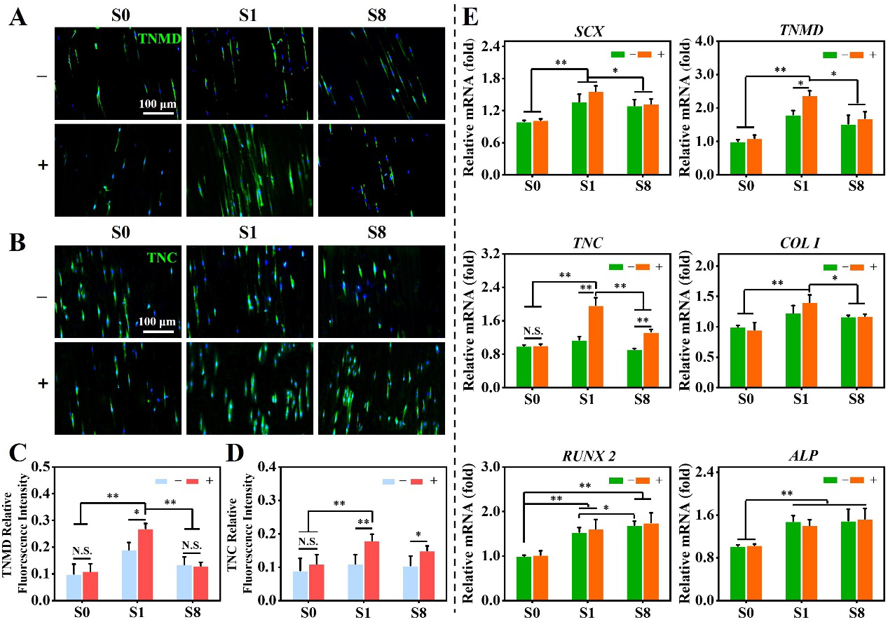 �D4. ���W�����w�S���MADSCs���켚�������ֻ�����A��B�����B7������־��TNMD�cTNC�����ߟɹ�Ⱦɫ�Y������C��D��TNMD�cTNC�ğɹ⏊�ȶ����Y������E�����B7���ADSCs�ɼ���ֻ���RT-PCR�z�y���P������_�Y����