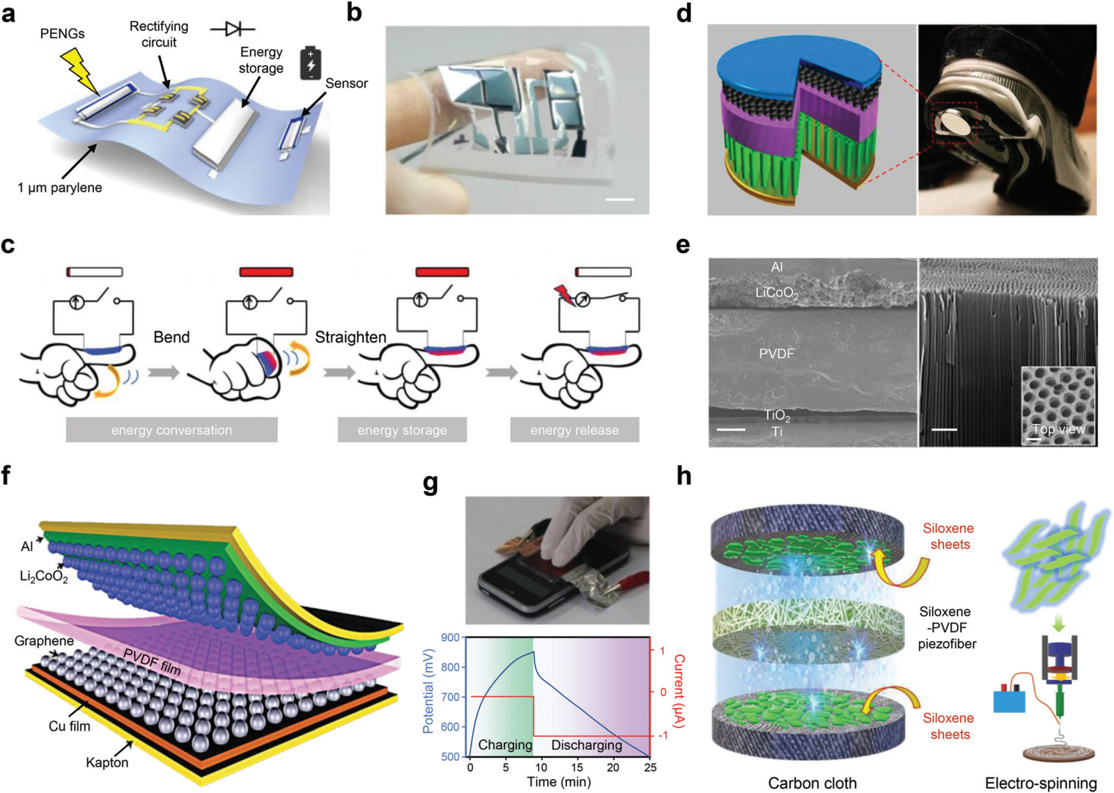 �D 8 �����ռ��ʹ惦�ļ��ɡ� (a) ������ 1 ��m ���ی����ױ������ϵ�һϵ�г����������ķ�����(b) �����ռ��������W�����ij����� PENG ����Ƭ�������ߣ�1 ���ס�(c) �{�ͺ�Ĥ�������\���µ������D�Q�̓���ʾ��D��(d) PENG����x��늳ػ�ϵ��Գ��늳ؽY���OӋ��(e) �Գ��늳صęM���� SEM �D�����½ǣ��������ߣ�30 ��m�����R�� TiO2 �{�ܵķŴ�D�����½ǣ��������ߣ�1 ��m����D�Ǽ{�ܵ��ҕ�D SEM �D�����ߣ�200 nm��(f) �@ʾ�����Գ��늳��OӋ��ʾ��D��(g) ͨ�^��ָ������늵������Գ��늳ص���Ƭ���ϲ�����һ�����͵��Գ�늺������ķ���^�̣��D����(h) ���ڹ�������Գ��늳ص�ʾ��D��