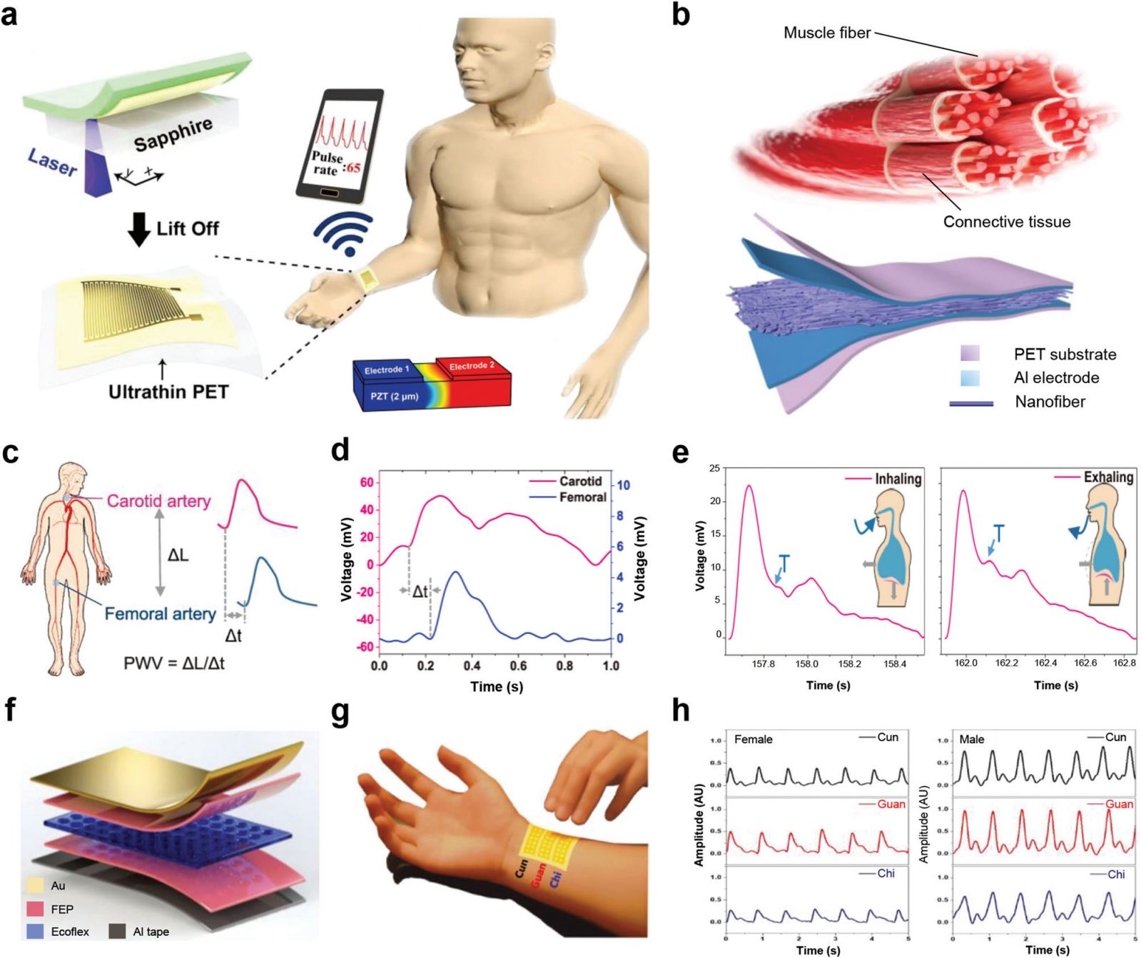 �D 11 ���������w�����е� PENG�� (a) ���� PZT ��Ĥ���Թ�늉����������������^��ʾ��D���� b ���ɽY���M�������ļ����w�S���Ƴɵļ����w�S���l��늼���Ʒ��ʾ��D��(c) PWV Ӌ��ʾ��D��(d) ���� PWV Ӌ����i�Ʉ��}�}�����Ρ�(e) ������^��������ͺ������g���ń��}�}�����Ρ�(f) ʹ�� FEP/Ecoflex/FEP �A�ӽY������v�O�w��Ĥ���}�_�����b��ʾ��D��(g) ģ�M�挍�t���Ă��y���t�}���ɼ�������ʹ����ָ�c�}���Б�ϵ�y�ڴ硢�P����λ�á�(h) �քe��Ů�Ժ�����־Ը���ڴ硢�P�ͳ�λ�Üy���ĵ����}�����Ρ�