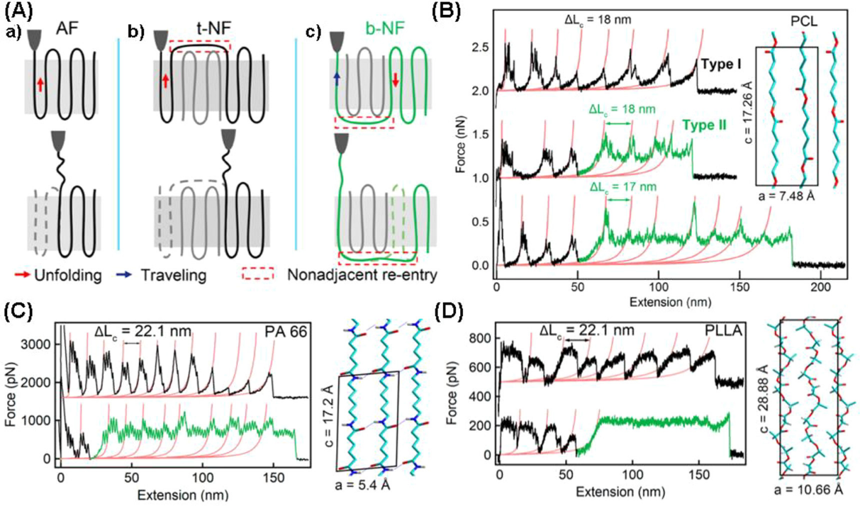 �ۺ���ξ����о���Y(ji��)���ۺ���������������О����ۯB�������wϵ�����Ŀƽ����n�}�M��2011���״Έ���˾�����ϩ��PEO���ξ��wϵ�{�����W���|(zh��)���о��Y(ji��)����ͨ�^��ԭ�����@�R��AFM�������c�η������V���g(sh��)�ЙC�Y(ji��)�ϣ����o�Ժ��m�Ę�Ʒ�Ƃ估ż(li��n)�������ɹ��،��Ηl�߷���朏�PEO���w�����������������y���˾��w�и߷�����g�������Ĵ�С��J. Am. Chem. Soc., 2011,133, 322�����ڴ˻��A(ch��)�ϣ�ԓ�n�}�M�Mһ���˷���Ʒ�Ƃ���y�}������l(f��)չ��һ�N���m�Ե��о��������ɹ��،�ԓ������(y��ng)�õ�����ϩ��PE�����۱�ϩ��PP��������66��PA66��������6��PA6���������ᣨPLLA���;ۼ���(n��i)����PCL���ȱ���߷��Ӿ��w�wϵ�������Y(ji��)�Ͼۺ���η������V���ܿط��ӄ����Wģ�M��ϵ�y(t��ng)�����˾��w�оۺ���朘�(g��u)��������ƽ����X����ƽ����X��朽M�ɡ��ۯBģʽ�Լ����h(hu��n)���Ȍ��{�����W���|(zh��)��Ӱ�Ҏ(gu��)�ɡ������˾��w�и߷���朘�(g��u)���c��\��ģʽ֮�g��(li��n)ϵ�����������������r��ȡ�����\��ģʽ����ֵ׃���^ƽ��(w��n)�������^С������X朕��l(f��)��ճ���\�ӣ�stick-slip��������ֵ���F(xi��n)��X�����Langmuir, 2017, 33, 1826; Macromolecules, 2019, 52, 1327����ͬ�r�״�ͨ�^�η��ӌ���^�y��PA66��PA6���w�и߷������������׃�^���ж��ؚ��I�ĄӑB(t��i)�����c�����γ��^�̣��l(f��)�F(xi��n)�߷�����ھ��w�л����^�����M�и������D(zhu��n)ֱ�����I�����γɣ�ACS Macro Lett., 2018,7, 762����������������ָ�y���������V�������˾ۺ���朵��ۯBģʽ���η��Ӽ{�����W���|(zh��)��Ӱ�Ҏ(gu��)�ɣ��ǽ����ۯB�Y(ji��)��(g��u)�Ĵ��ڕ�ʹ�����������^���мȰ����ۺ���朵Ľ��ۯB�ְ����o������ھ��w�еĴ��Ѓɂ��^�̣��������W푑�(y��ng)��̖�įB�ӡ�������X��(g��u)��ľۺ���朣��������������w�F(xi��n)��С��X��ƽ�_����Ĵ���X�ij��F(xi��n)���D3B��3C�еľGɫ������������������(g��u)��ľۺ���朣��ǽ����ۯB�����¸�����ֵ���Lƽ�_���W��̖�ij��F(xi��n)������������Ϣ��ԓ�n�}�M�ɹ��ؽ����˸߷��Ӿ��w����ۯBģʽ�Ķ������о��·�����ԓ�����o�茦��Ʒ�M�И�ӛ�����кܺõ����m�ԣ��о��Y(ji��)���@ʾ��Һ���Ƃ�ĸ߷��Ӿ��w�н���Ҏ(gu��)���ۯBģʽ��ռ�����ܸߣ���91%�����������Ӄ�(n��i)����Ì��Y(ji��)���^�������P(gu��n)�I���ã�ACS Macro Lett., 2019, 8, 1194�� ACS Editors�� Choice����ͨ�^���W��͗l����(y��u)���������˿՚���ۺ���η������V�������@�����������W�y�����ȣ���23 pN������4 pN���Լ��������ʣ���10 ��m/s�����100 ��m/s�������ɹ��z�y��PEO�ۯB����γɵĭh(hu��n)��朣�loop���Y(ji��)��(g��u)�ھ��w�������\�ӵ����g�B(t��i)��Macromolecules, 2018, 51, 7052����ͬ�r�l(f��)�F(xi��n)���w��̎�h(hu��n)�����{�����W���|(zh��)Ӱ��@�����ۺ����c�܇����|(zh��)�Ľ�����Խ�ߣ�������ֵԽ�ߣ����w���W��(w��n)����Խ�á�