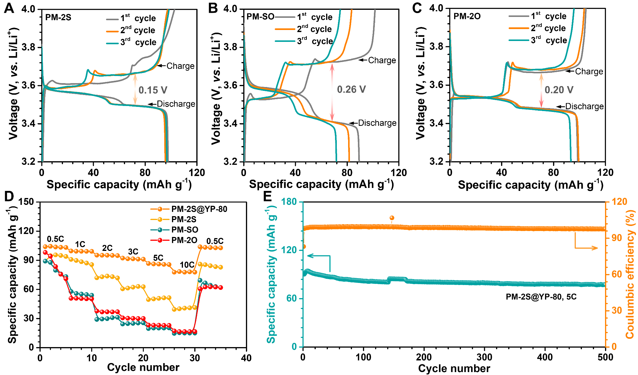 3. ���늉�ƽ�_(t��i)�ӽ�3.6 V���λ�g϶����0.15 V��5C��500��ѭ�h(hu��n)�����������ʞ�85% (PM-2S)��