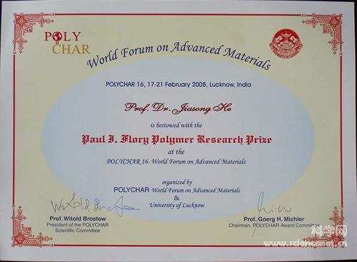 ��2008��P(gu��n)OLYCHAR 16�����M(j��n)��������Փ��(World Forum on Advanced Materials)�ϣ��μ����о��T�����衰Paul J. Flory Polymer Research Prize����ԓ���(xi��ng)2000���ɇ��HPOLYCHARί�T����o(j��)��߷��ӽ������ƌW(xu��)�ҡ��Zؐ�����@����Paul J. Flory���O(sh��)�������ڱ��Ì��߷��ӿƌW(xu��)�����I(l��ng)��ĸ��ģ�͡���Փ���^�̻�l(f��)�F(xi��n)��ԭʼ��(chu��ng)�º�ͻ��ؕ�I(xi��n)�ĿƌW(xu��)�ҡ��μ����о��T�������ԭλ���s��(f��)�ϲ��ϡ��ĸ���l(f��)�F(xi��n)����׃���sЧ��(y��ng)������a(ch��n)�������ۺ������w�ėl�������ɞ鱾���ԓ���(xi��ng)��Ψһ�@��?w��)ߡ?/P>