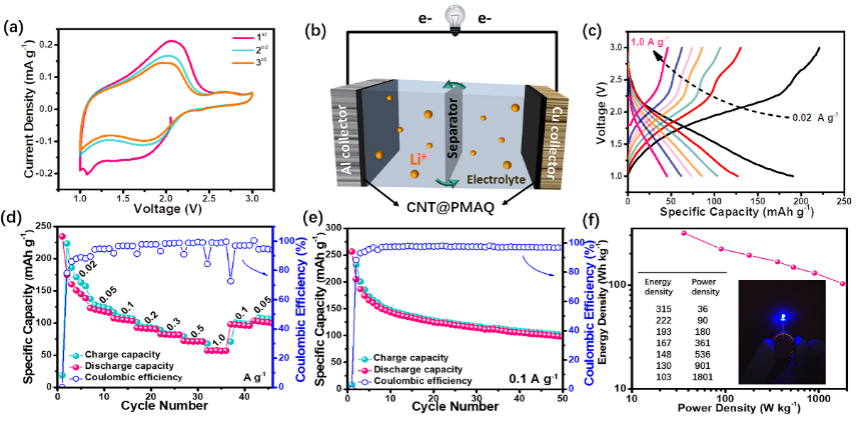 �о��l(f��)�F(xi��n)����CNT@PMAQ�����O����0.05 A g-1�r���������_(d��)163 mAh g-1����CNT@PMAQ��ؓ(f��)�O�����乲ܗ���h(hu��n)��䇻��C(j��)�ƣ���0.05 A g-1�r���������_(d��)1158 mAh g-1���M(j��n)һ������CNT@PMAQ���ص��p�O������������錦�Q늘O��(g��u)���ۺ����ȫ늳أ��䷀(w��n)������늉��_(d��)1.8 V����߸������ܶȡ��߹����ܶȺ��Lѭ�h(hu��n)���ܣ��D3, 4����ԓ��������朹��̻����ԣ���(g��u)�쪚�ص��o�C(j��)/�ЙC(j��)��-�����|(zh��)�{�Y(ji��)��(g��u)����߾ۺ���늘O���Ի��F(tu��n)��(sh��)�ͻ���λ�c�����ʣ����F(xi��n)�˸߱���늺ɴ惦�������p�O�Ծۺ���늘O��(g��u)�����Qȫ늳أ���l(f��)չ�����ܡ��ͳɱ����ɳ��m(x��)�������ЙC(j��)늳��ṩ���·��������^�c��