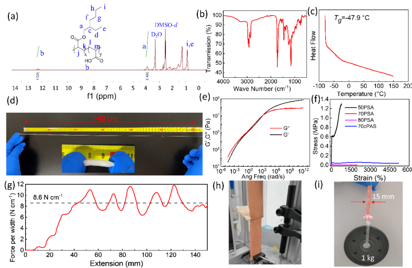 �D1����a��70cPSA��1H NMR�V�D��(b) 70cPSA��FT-IR�V�D��(c) 70cPSA��DSC������(d) 70cPSA�������^(gu��)�̵���Ƭ��(e) 70cPSA�ă�(ch��)��ģ��(G'')�͓p��ģ��(G")��(f)��ͬPSAs������ԇ�(y��n)��(g) ��70cPSA��ճ�Y(ji��)�����~���Ľ��渽����ԇ�(y��n)��180�����xԇ�(y��n)����(h)180�����xԇ�(y��n)��Ƭ��(i) ��⏺��~����180o���xԇ�(y��n)����Ƭ��